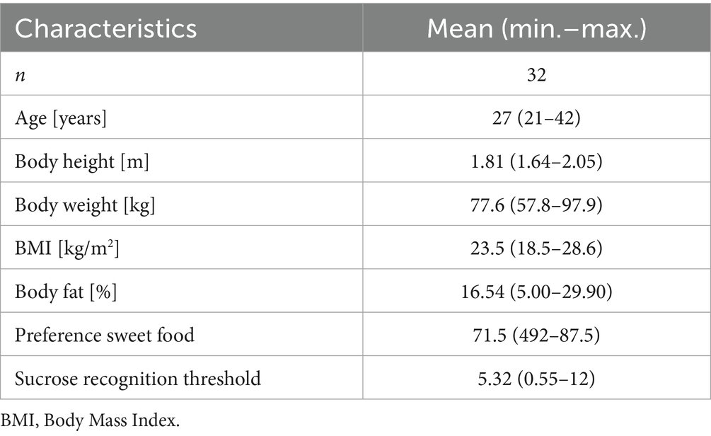 In this study, we hypothesized that reducing the caloric load of a sucrose solution while maintaining the perceived sweetness intensity by adding a FMP attenuates large fluctuations in the postprandial blood glucose regulation with beneficial effects on appetite and cravings for sweet foods. This may ultimately reduce postprandial total energy intake. In a randomized cross-over human intervention study, the test persons received two equi-sweet test solutions differing in their caloric load on two separate test days in a randomized order. Our study population consisted of 32 normal-weight adults with an average BMI of 23.5 ± 2.3 kg/m2 and a mean body fat percentage of 16.5 ± 6.6%. Supplementary Figures 2B–D illustrate the distribution of body weight, BMI and body fat percentage among the study cohort. Participants also exhibited an average sweet preference score of 71.5 ± 9.4 out of a possible 100 points. All participants reached a sucrose recognition threshold below 12.1 g sucrose per liter and there was no correlation with participants BMI or body fat percentage identified (data not shown). Detailed anthropometric characteristics are presented in Table 1.