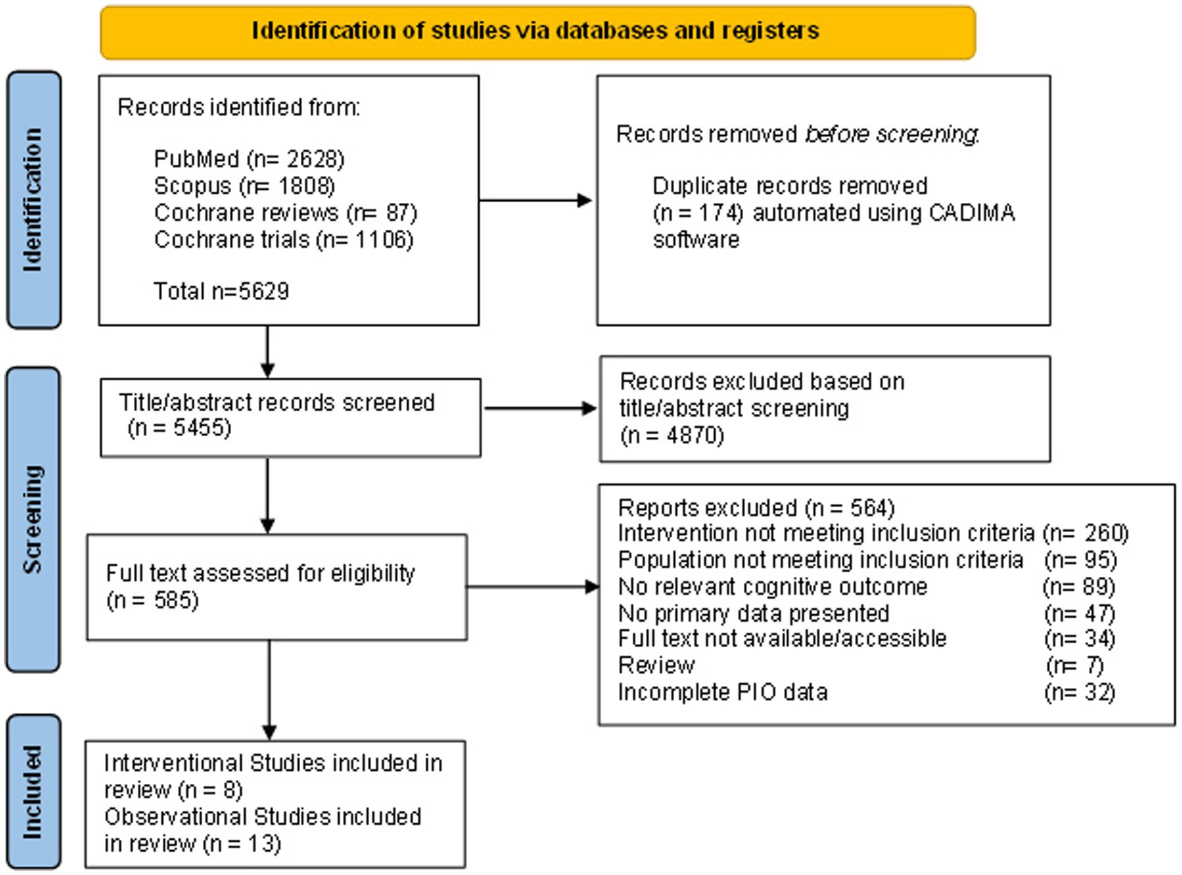 Flowchart outlining the identification of studies via databases and registers. Identification phase: 5,629 records found across PubMed, Scopus, Cochrane reviews, and trials. After removing 174 duplicates, 5,455 titles/abstracts were screened. Screening phase: 4,870 records were excluded. Eligibility assessment involved 585 full-text articles, excluding 564 for reasons like unmet criteria or lack of data. Final inclusion: 8 interventional and 13 observational studies.