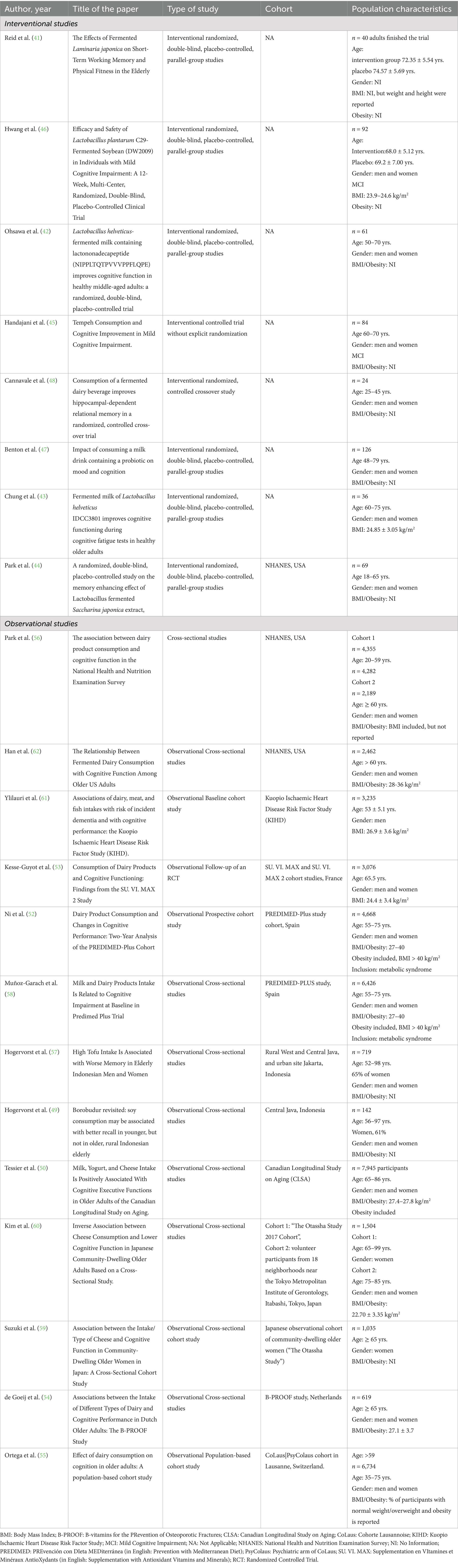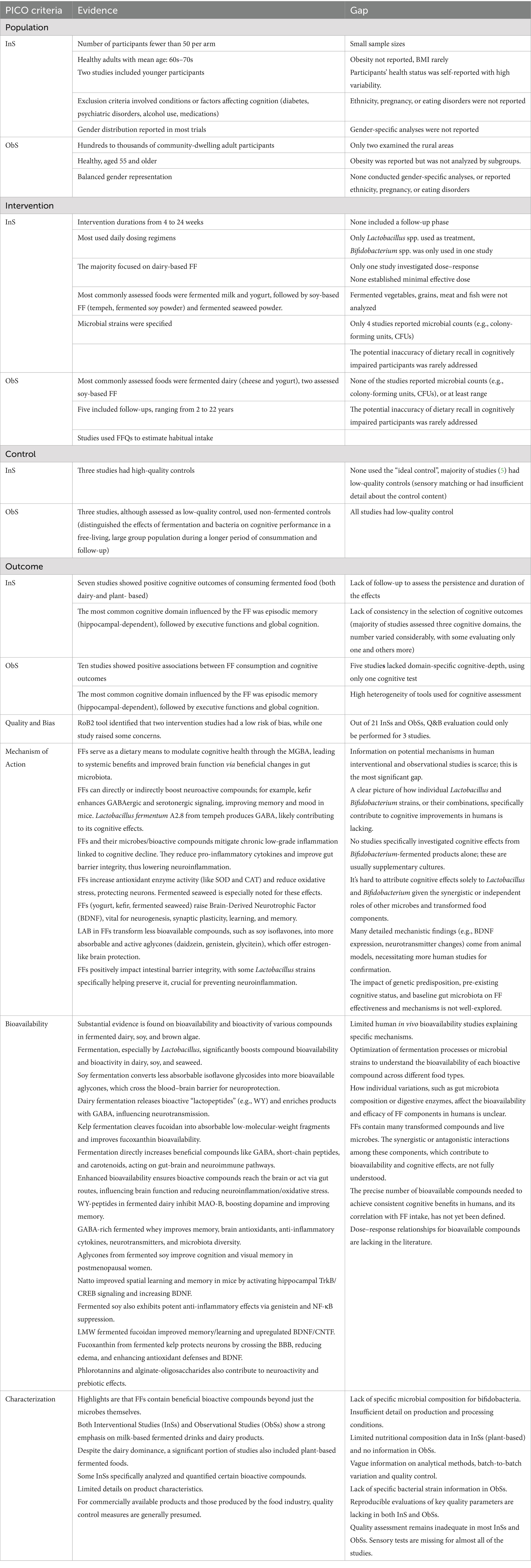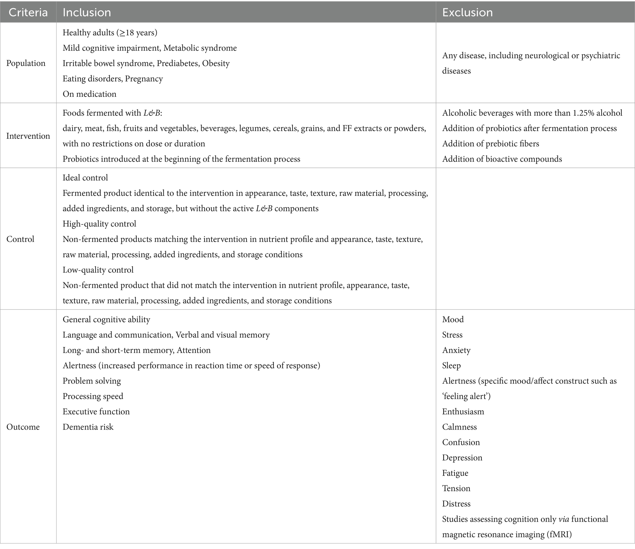 Therefore, this systematic review, conducted within the framework of COST Action CA20128 – PIMENTO (Working Group 3), aims to critically evaluate the association between the consumption of Lactobacillus- and Bifidobacterium-FFs and cognitive outcomes in healthy adults and individuals with mild cognitive impairment (MCI), using evidence from interventional studies (InSs) and observational studies (ObSs). In accordance with the guidelines set forth by the EFSA, “an increase, maintenance, or reduced loss of cognitive function in one or more of its domains is considered a beneficial physiological effect” (29) and we evaluated several domains related to cognition: episodic memory (verbal and visual), executive functions (attention, alertness, working memory, problem-solving), speed processing and global cognition (30). The review follows a registered study protocol1 and the structured methodology proposed by Muka et al. (31), which incorporates principles of Cochrane systematic reviews, including study selection, risk of bias (RoB) assessment and evidence synthesis (39). In line with EFSA’s scientific requirements for health claims (19, 20) the review also includes a non-systematic component addressing food characteristics, mechanisms of action, bioavailability and safety. This comprehensive approach provides new insights into practical, real-world nutritional strategies for cognitive health while highlighting important research gaps and methodological limitations.