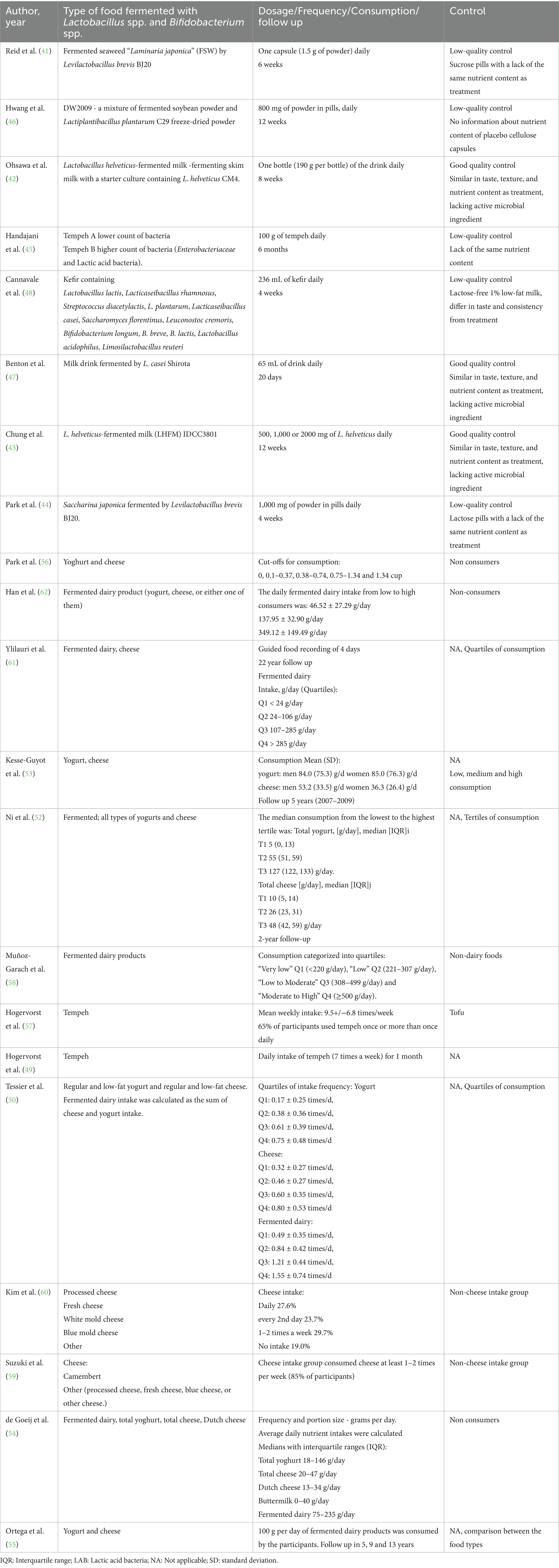 1. Ideal control was set to be a fermented product identical to the intervention in appearance, taste, texture, raw material, processing, added ingredients, and storage, but without the active L&B components. No study included an ideal control.