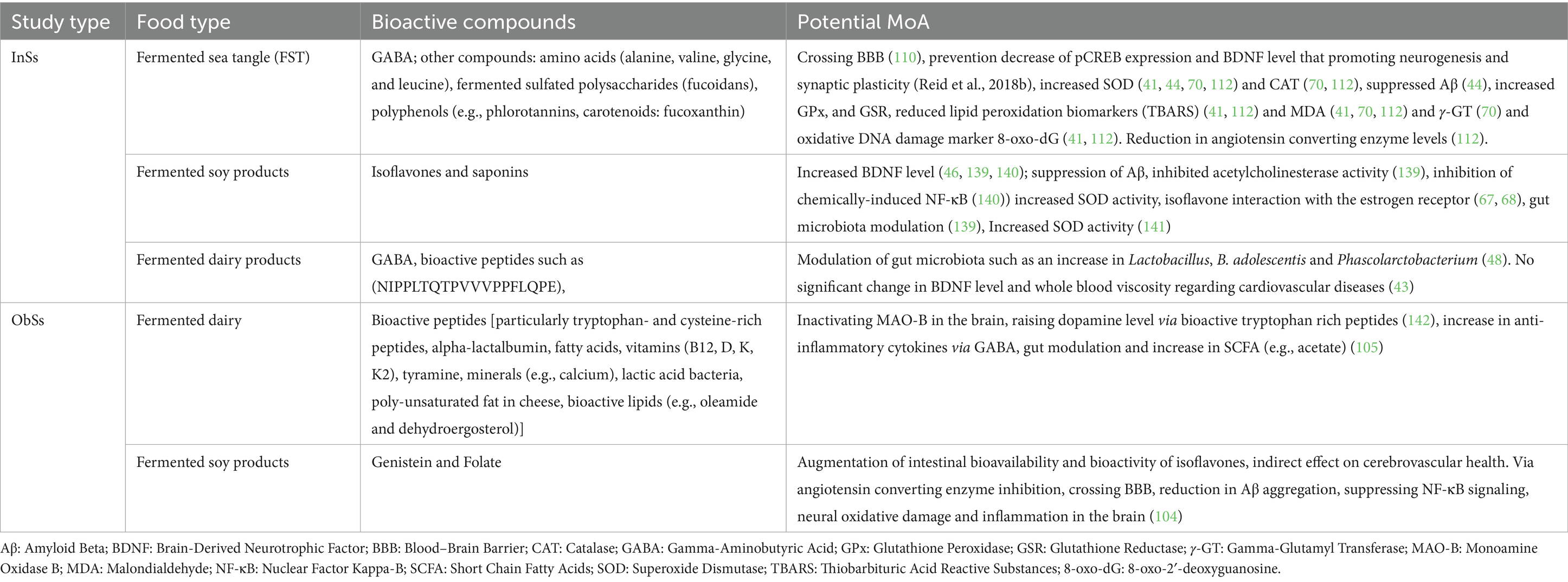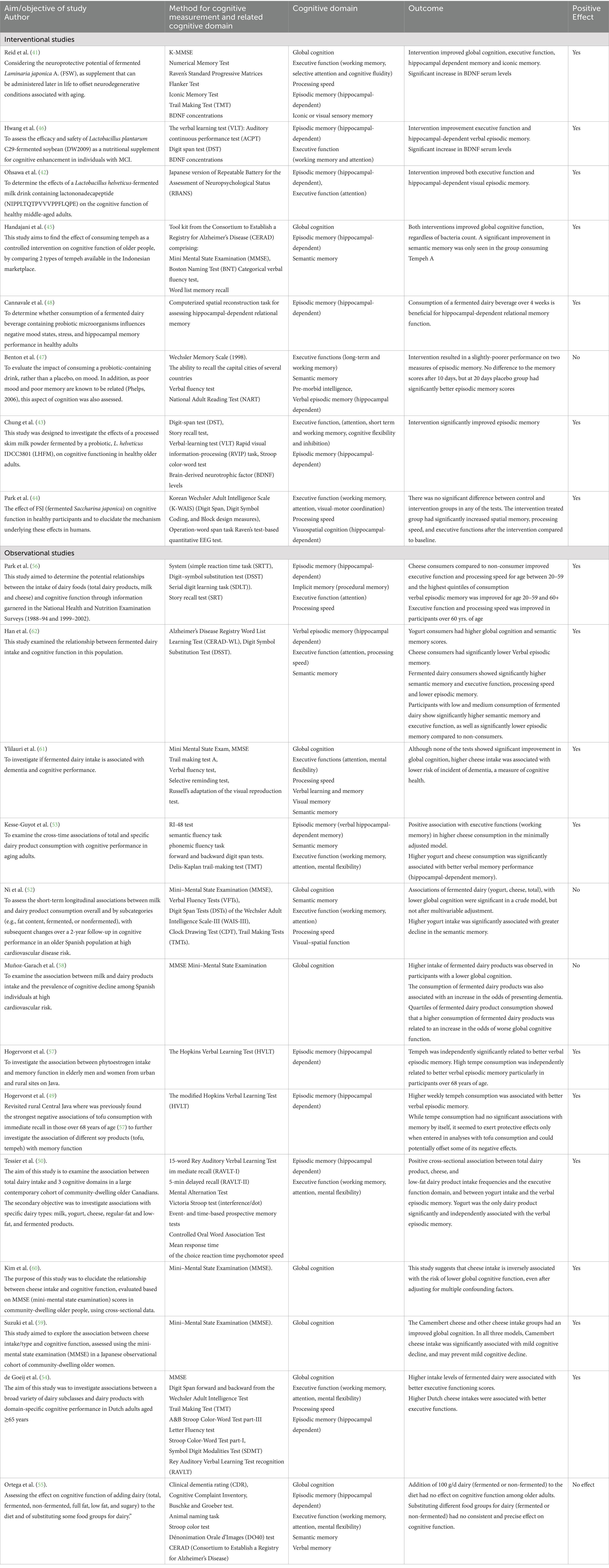 The impact of consuming foods fermented with L&B on cognitive performance was assessed through human studies using tests across various cognitive domains (36, 37), including dementia risk as a measure of cognitive health. We excluded studies focused solely on mental health domains.