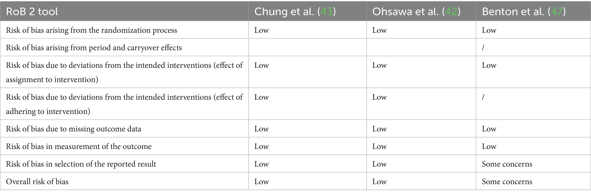 If control quality was found to be sufficient (see section 17, Study Protocol (39)) we performed Quality and bias of study (Q&B) evaluation in those articles. If not, Q&B was not performed. The evaluation of control and Q&B was performed independently by two reviewers for each study. For RCTs, we used the Revised Cochrane RoB tool for randomized trials (RoB 2) (40), evaluating five domains: randomization, deviations from intended interventions, missing data, measurement of outcomes, and selection of the reported result. Each trial was rated as having low, some concerns, or high RoB on those domains.