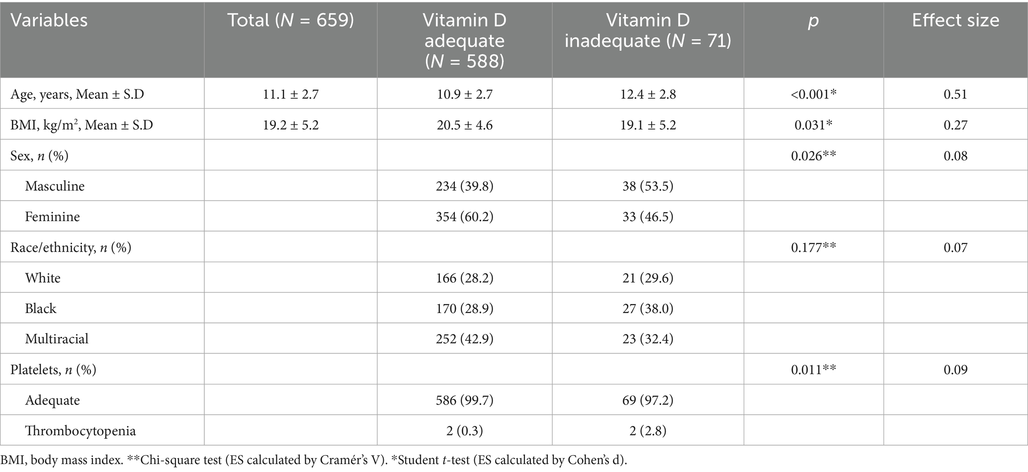 The demographic and clinical characteristics of the population, stratified by vitamin D status, are detailed in Table 1. The group with insufficient vitamin D presented a significantly higher mean age and BMI in comparison to the group with adequate levels of vitamin D (p < 0.001; ES = 0.51 and p = 0.031; ES = 0.27, respectively). Additionally, statistically significant associations were observed between vitamin D status and the variables sex (p = 0.026; ES = 0.08), and prevalence of thrombocytopenia (p = 0.011; 0.09).
