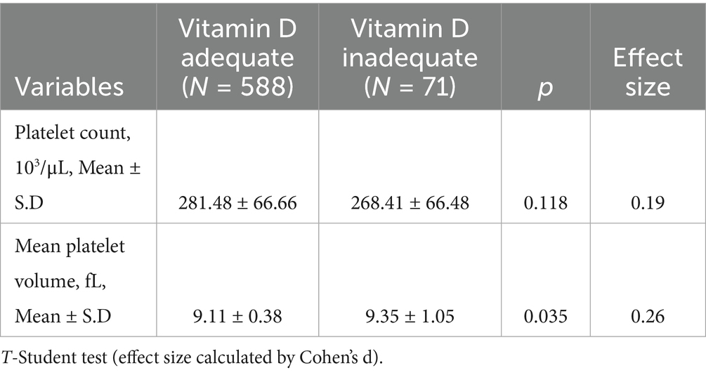 Table 2 shows the comparison between groups with adequate and inadequate vitamin D levels. The group with inadequate vitamin D presented a significantly higher MPV compared to the group with adequate levels (9.35 fL vs. 9.11 fL; p = 0.035; ES = 0.26). The platelet count was, on average, lower in the group with vitamin D inadequacy (268.41 ×103/μL) in relation to the adequate group (281.48 ×103/μL); however, this difference did not reach statistical significance (p = 0.118; ES = 0.19) (see Table 3).