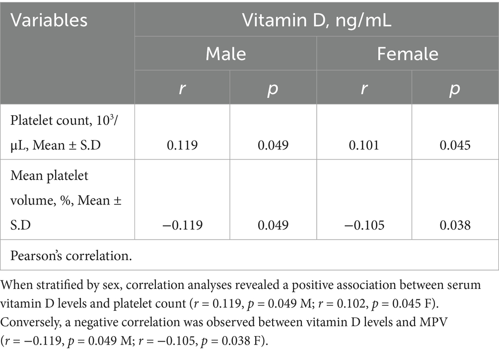 When stratified by sex, correlation analyses revealed a positive association between serum vitamin D levels and platelet count (r = 0.119, p = 0.049 M; r = 0.102, p = 0.045 F). Conversely, a negative correlation was observed between vitamin D levels and MPV (r = −0.119, p = 0.049 M; r = −0.105, p = 0.038 F).