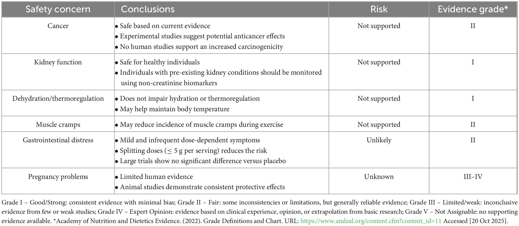 2. Current evidence does not support a link between its supplementation and increased cancer risk nor renal dysfunction in humans.