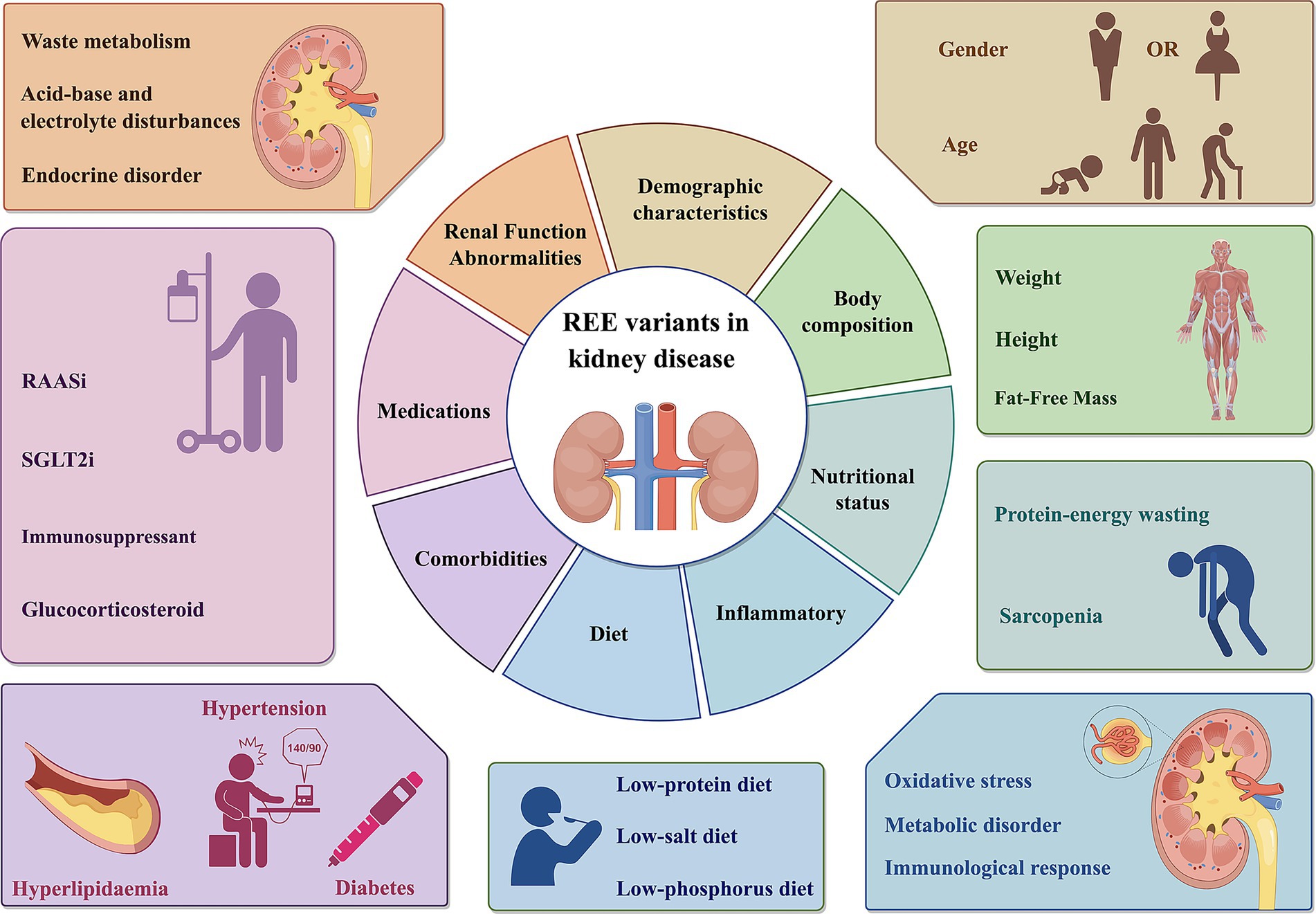 Figure 1. REE variants in kidney disease. The REE of patients with renal diseases is influenced by multiple factors, including body composition, demographic characteristics, renal function abnormalities, nutritional status, inflammatory, comorbidities, medications. REE, Resting energy expenditure; SGLT2i, Sodium-Glucose Co-Transporter 2 Inhibitor; RASSi, Renin-Angiotensin-Aldosterone System Inhibitors. This figure was created using Figdraw.com.