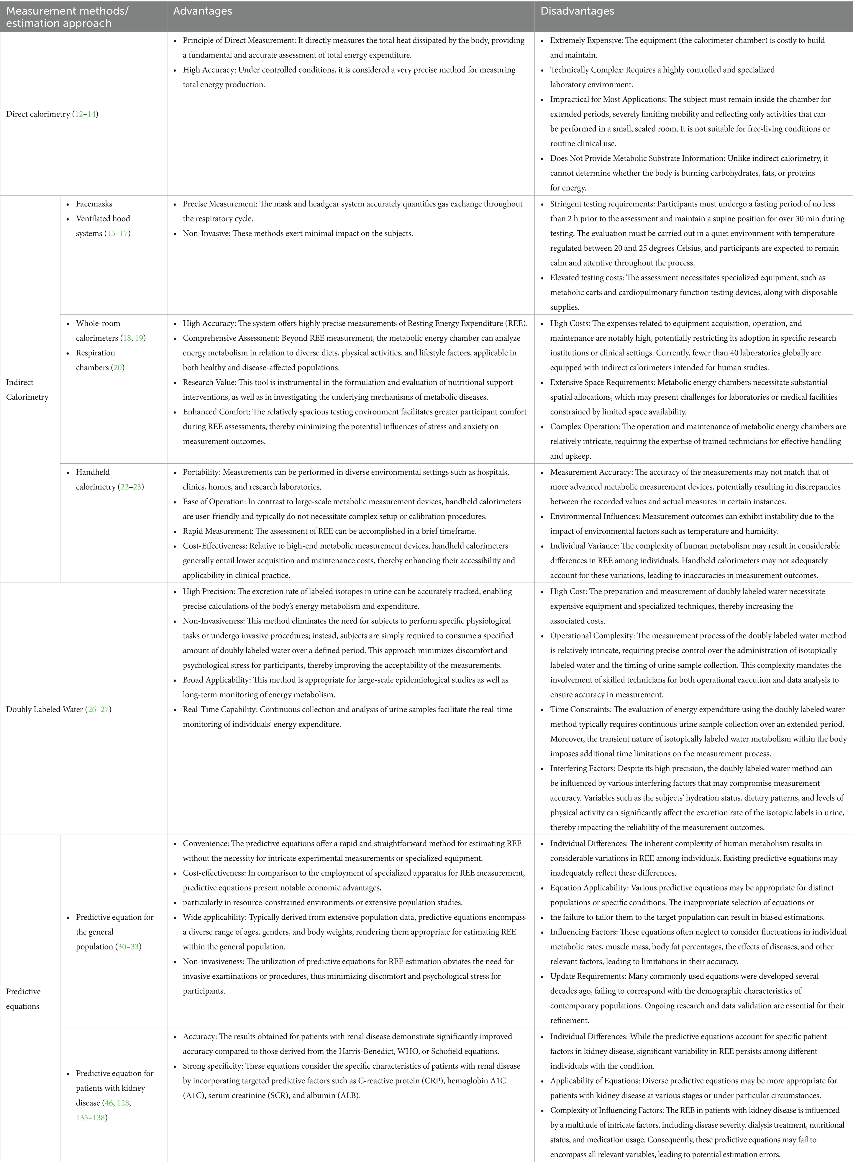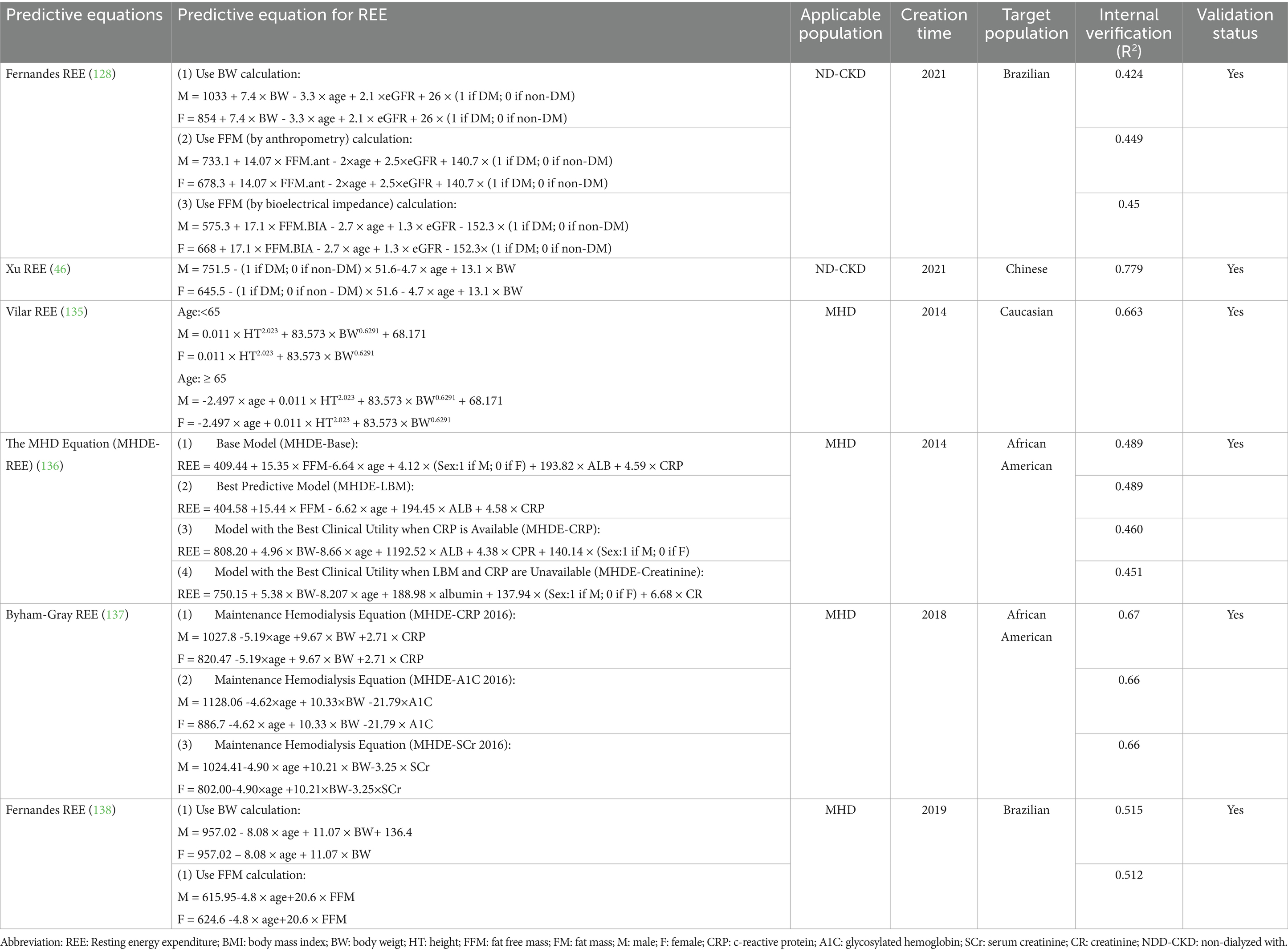 Numerous research teams have developed equations to predict REE for ND-CKD patients. Fernandes et al. introduced three novel REE prediction equations tailored for ND-CKD patients (128). These equations leveraged variables associated with the patients’ body composition, including weight, height, and fat-free mass. Additionally, Xu et al. (46) formulated and validated a new REE prediction equation specifically for ND-CKD patients, which incorporated fundamental patient data such as gender, age, weight, and the presence of diabetes. Comparisons with REE measurements obtained via indirect calorimetry indicated that the accuracy of these equations within the validation cohort was satisfactory. (Table 3).