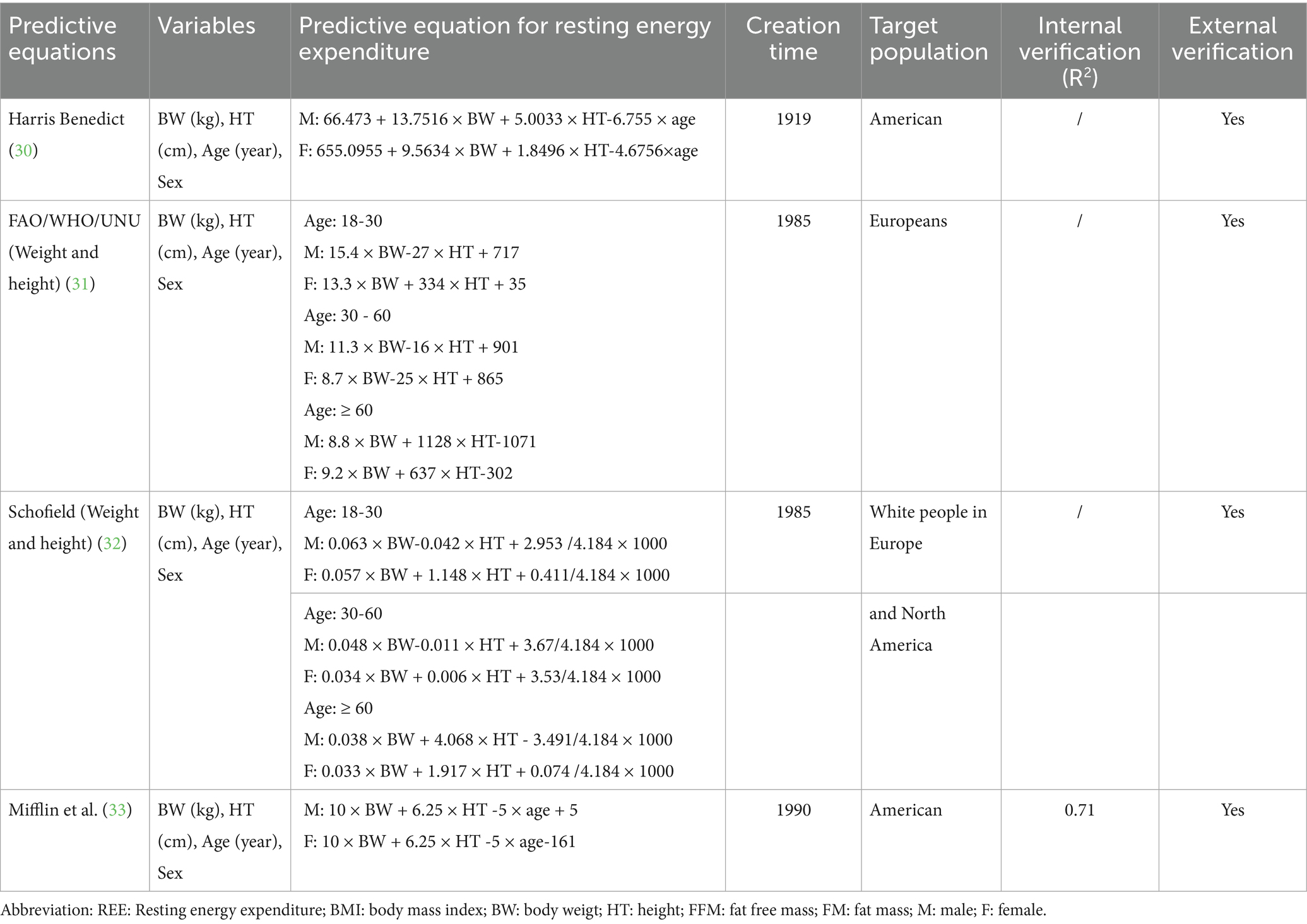 The predictive equations method is an estimation approach designed to estimate the energy expenditure of the human body at complete rest, utilizing demographic, body composition, and disease-related data. These equations allow for a rapid estimation of an individual’s REE (Table 1). Common predictive equations include the Harris-Benedict, FAO/WHO/UNU, Schofield, and Mifflin formulas (28–33), with specific equations detailed in Table 2.
