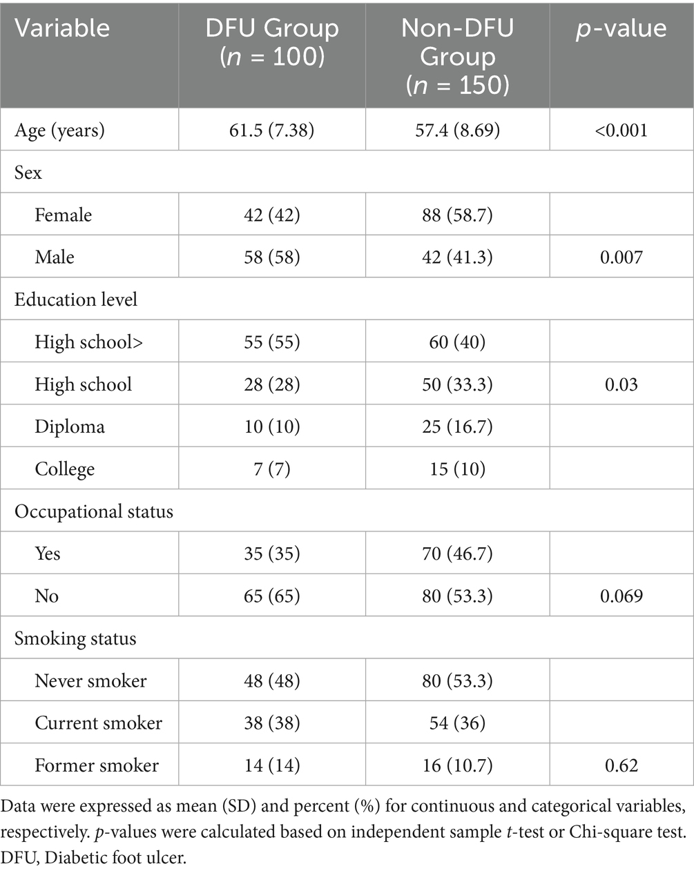 The study included 250 individuals diagnosed with T2DM, with a mean age of 59 years. Of these, 100 were in the DFU group and 150 were in the non-DFU group. The DFU group had a higher mean age of 61.5 ± 7.38 years compared to 57.4 ± 8.69 years in the non-DFU group (p < 0.001). There was also a significant difference in education levels between the two groups (p = 0.03), with more participants in the DFU group having an education level below high school (Table 1).
