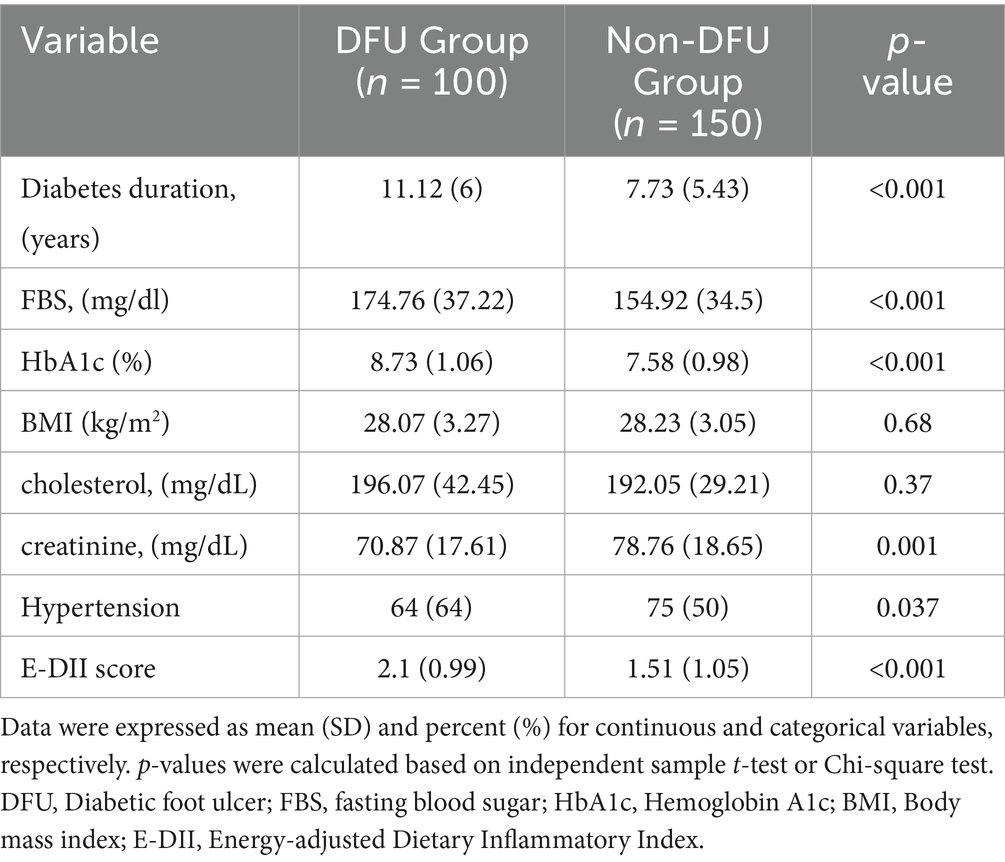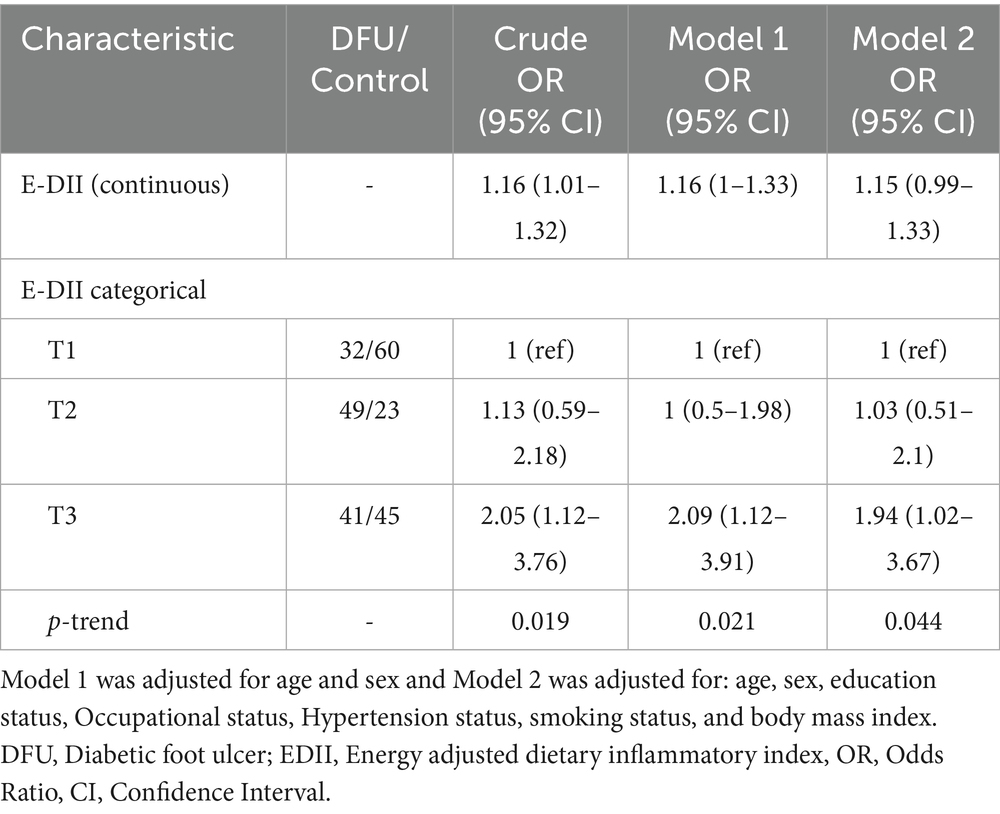 Methods: In a case–control study, 100 patients with DFUs and 150 T2DM controls were recruited. Dietary intake was assessed using a validated FFQ, and E-DII scores were calculated. Logistic regression estimated odds of DFUs across E-DII tertiles.