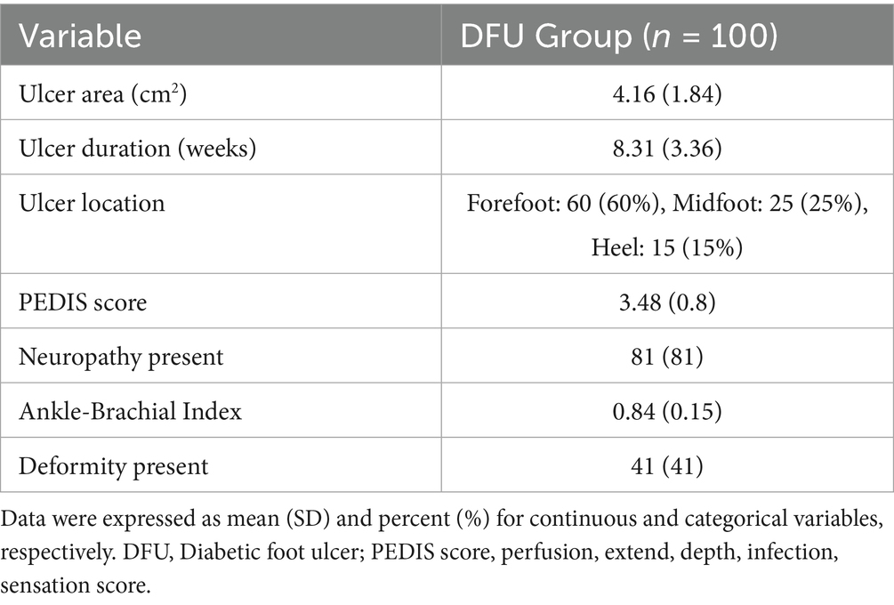 Characteristics of DFU in subjects based on size, duration, location, presence of deformity, Ankle-Brachial Index, and severity of DFU using the PEDIS assessment are presented in Table 3. Among those with DFU, the mean ulcer area was 4.16 ± 1.84 cm2, with average ulcer duration of 8.31 ± 3.36 weeks. Most ulcers were located on the forefoot (60%), followed by the midfoot (25%) and heel (15%). The mean PEDIS score was 3.48 ± 0.8, and neuropathy was present in 81% of participants. The mean ankle-brachial index was 0.84 ± 0.15, and foot deformities were noted in 41% of patients.