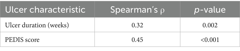 E-DII scores were significantly and positively correlated with both ulcer duration (ρ = 0.32, p = 0.002) and PEDIS score (ρ = 0.45, p < 0.001), indicating that more pro-inflammatory diets were associated with more severe and prolonged ulcers (Table 4).