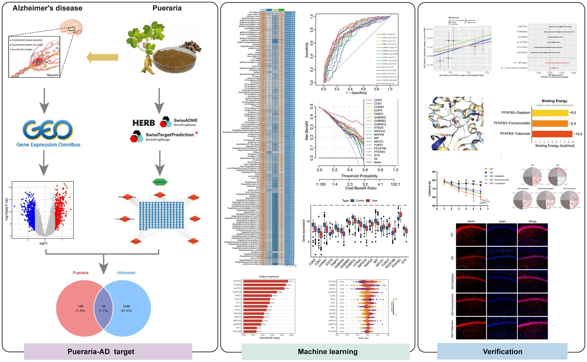 This study employed an integrated approach combining network pharmacology, machine learning, and experimental validation to systematically elucidate the molecular mechanisms underlying the therapeutic effects of Pueraria against Alzheimer’s disease (AD). Network pharmacological analysis identified 45 overlapping targets between Pueraria and AD, representing key convergence points in the complex pathological networks of neurodegeneration. The integration of 127 distinct algorithmic combinations through machine learning established a robust framework for therapeutic target prioritization, with the RF + XGBoost model demonstrating superior performance across multiple independent validation datasets (AUC = 0.792). Notably, PFKFB3 emerged as the most promising therapeutic target, exhibiting the highest diagnostic value (AUC = 0.805) and showing significant causal relationships with AD through Mendelian randomization analysis. Experimental validation further confirmed that Pueraria’s bioactive compounds—daidzein, formononetin, and tuberosin—effectively ameliorated Abeta1-42-induced cognitive dysfunction and neuronal loss in AD mouse models, bridging computational predictions with biological reality.