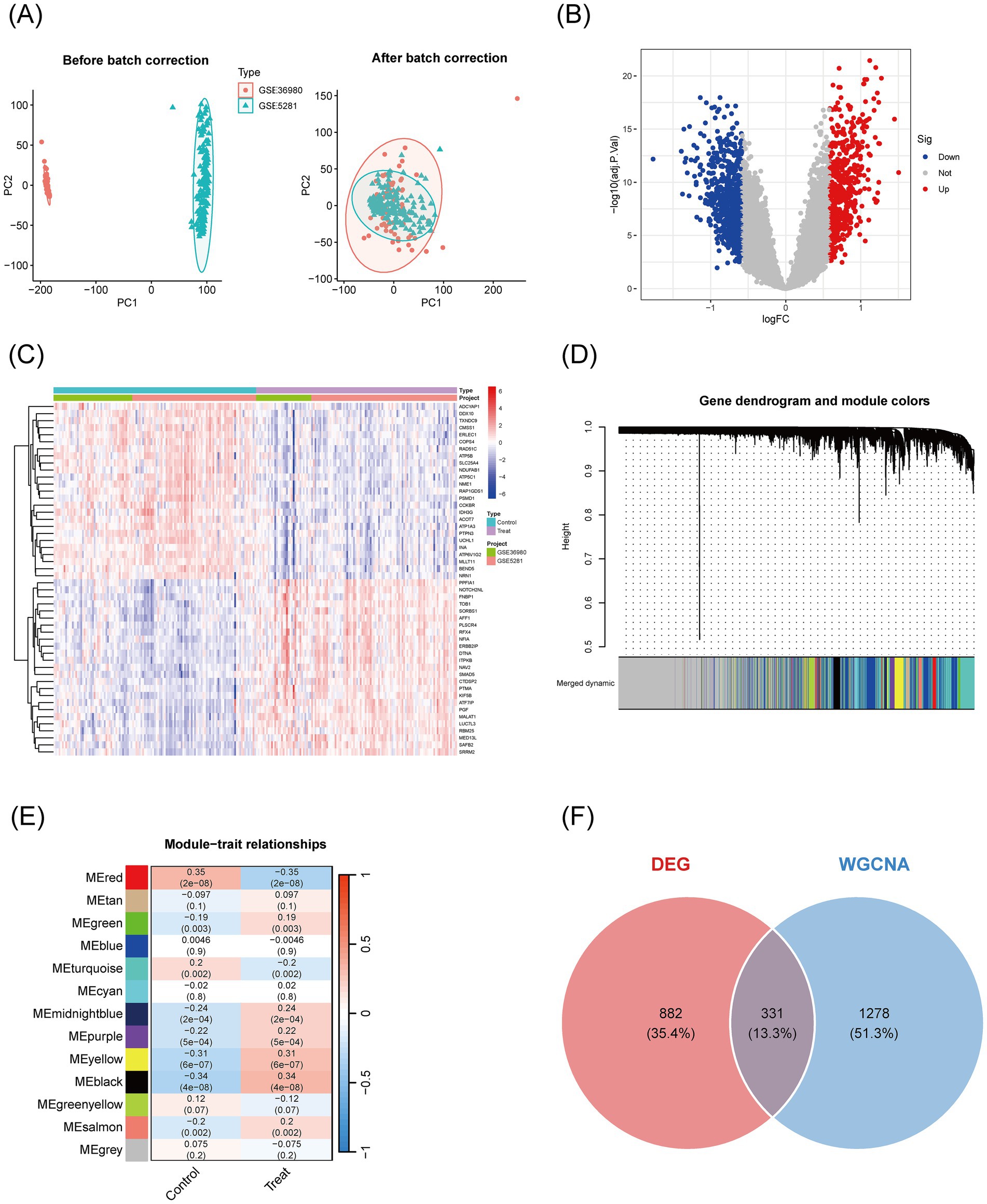 Figure 2. Visualization of differentially expressed genes in Alzheimer’s disease transcriptomic data and WGCNA feature genes. (A) PCA plots before and after batch correction: The horizontal axis (PC1) and vertical axis (PC2) show the distribution of samples; the left plot shows the distribution before correction (red circles for GSE36980, blue triangles for GSE5281), and the right plot shows the distribution after correction, with mixed samples and ellipses indicating overlapping distributions, confirming that batch effects have been removed. (B) Volcano plot of differentially expressed genes: Displays the significance of gene expression changes, with the horizontal axis representing logFC (from −1 to 1) and the vertical axis representing −log10(adj. p-value) (from 0 to 20). Red points indicate significantly upregulated genes, blue points indicate significantly downregulated genes, and gray points represent non-significant genes. (C) Heatmap of differentially expressed genes: Visualizes the expression patterns of 50 DEGs in the control group (left) and disease group (right). Red indicates high expression (logFC >0), blue indicates low expression (logFC <0), and white indicates intermediate levels, showing significant expression differences between groups. (D) Gene clustering tree and module color map: Genes are shown on the x-axis, and clustering height is on the y-axis. The color bars below indicate different modules (e.g., “merged dynamic”) used for gene module partitioning. (E) Module-trait relationship heatmap: Modules are on the x-axis, and correlations are on the y-axis. The color intensity (red = positive correlation, blue = negative correlation) and numerical values (correlation coefficients and p-values) indicate the strength of the association between modules and traits. (F) Venn diagram: The orange circle represents DEGs, and the blue circle represents WGCNA feature genes. The numbers indicate the size of the intersection, identifying key candidate genes.