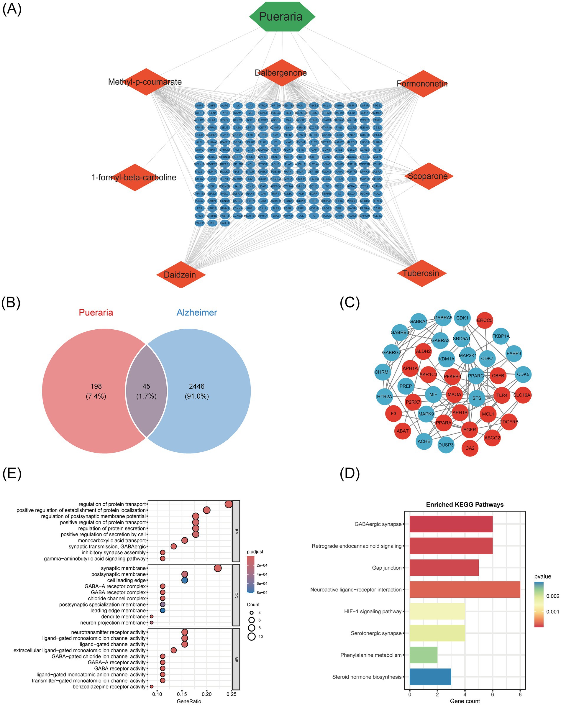 Figure 3. Identification of common targets between Pueraria and Alzheimer’s disease and functional enrichment analysis. (A) Interaction network between the active components of Pueraria (diamond nodes) and target genes (hexagonal nodes, 236 in total), showing multi-component-multi-target regulatory characteristics through the connections. (B) Venn diagram showing the intersection of 45 genes (1.7%) between Pueraria target genes (orange circle, 198 genes, 7.4%) and AD characteristic genes (blue circle, 2,446 genes, 91.0%), indicating potential intervention targets. (C) Expression pattern network diagram of the intersecting genes in AD, with red nodes (increased expression) and blue nodes (decreased expression), and connections representing gene interaction relationships. (D) GO enrichment analysis of the intersection genes, presented in bar (left) and bubble (right) charts. The analysis shows significant enrichment in cellular components, biological processes, and molecular functions, with gene ratio and adjusted p-values. (E) Bar chart of KEGG pathway enrichment for the intersecting genes, with the vertical axis representing pathways and the horizontal axis representing the number of genes. The color gradient indicates enrichment significance, with red indicating smaller p-values.