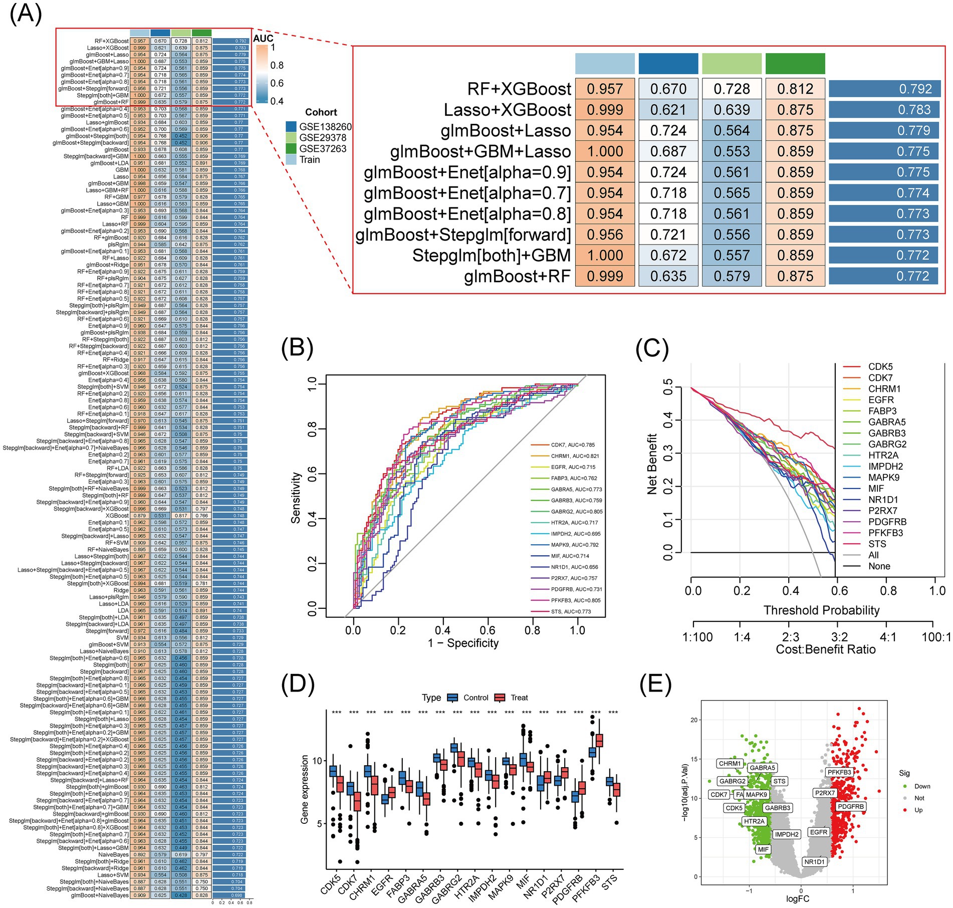 Figure 4. Core therapeutic target screening and validation based on machine learning algorithms. (A) Heatmap of the results from 127 machine learning models: Shows the AUC values of different model combinations on the training and test sets. Color gradients represent performance levels (blue for low values and red for high values). (B) ROC curves for 17 core genes: The x-axis represents specificity, and the y-axis represents sensitivity. The curves display the classification performance of each gene, with AUC values ranging from 0.715 to 0.829. (C) Decision curves for 17 core genes: The horizontal axis represents the threshold probability, and the vertical axis represents net benefit. The curves assess clinical utility at different cost-effectiveness ratios, with higher curves indicating greater net benefits. (D) Box plot of the expression of 17 core genes in Alzheimer’s disease: Compares gene expression levels between AD patients (Treat) and control subjects (Control). (E) Volcano plot of the expression of 17 core genes: The x-axis represents logFC (threshold ±0.585 corresponds to a 1.5-fold difference), and the vertical axis represents −log10(adj. p-value) (threshold 1.3 corresponds to adj. p-value = 0.05). Red points indicate significantly upregulated genes, blue points indicate downregulated genes, and gray points indicate non-significant genes.