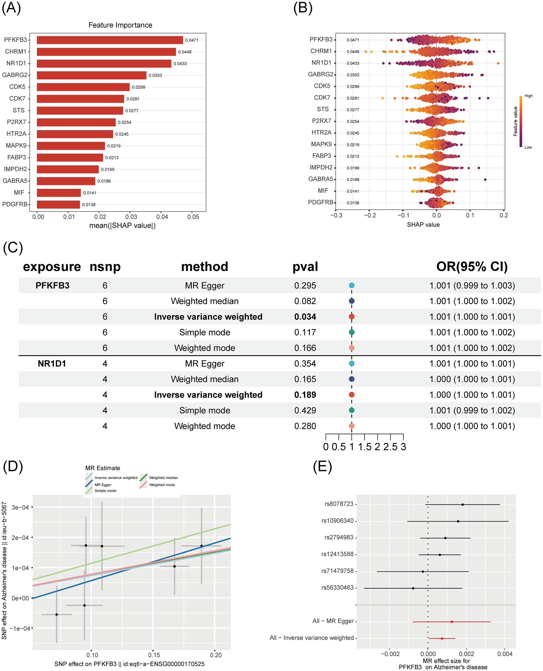 Figure 5. Comprehensive analysis of the importance and causal relationship of core genes in Alzheimer’s disease. (A) SHAP importance bar chart: Shows the average absolute SHAP value (mean (|SHAP value|)) for each gene, with higher values indicating greater importance in the machine learning model. Genes are sorted in descending order of importance. (B) SHAP swarm plot: Displays the distribution of SHAP values for each gene. Points represent individual samples, with colors indicating the magnitude of feature values (blue for low, red for high), visualizing the influence of gene feature values on prediction outcomes. (C) Mendelian randomization forest plot: Shows the odds ratio (OR) and 95% confidence interval for the association between genes and Alzheimer’s disease, using different MR methods. p-values are annotated to assess the significance of causal associations. (D) Mendelian randomization scatter plot: Illustrates the relationship between the effect of SNPs on PFKFB3 and their effect on Alzheimer’s disease, with colored points representing different estimation methods. This plot visually displays the direction of causal effects. (E) Mendelian randomization forest plot (SNP level): Shows the effect sizes and confidence intervals of individual SNPs and their combined methods, assessing the robustness of the causal association between PFKFB3 and Alzheimer’s disease.