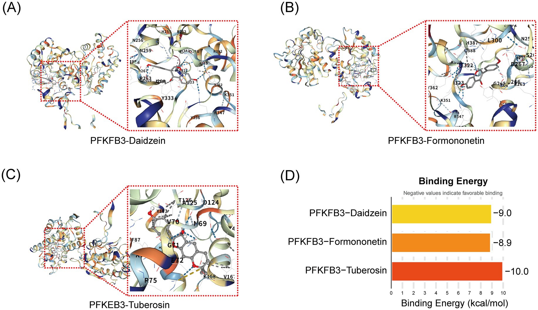 Figure 6. Molecular docking validation of active components of Pueraria and PFKFB3 target. (A–C) Binding conformation diagrams for the docking of daidzein, formononetin, and tuberosin with the PFKFB3 protein. (D) Target protein binding energy bar chart: The vertical axis represents different target proteins and active components (PFKFB3-daidzein, PFKFB3-formononetin, PFKFB3-tuberosin), while the horizontal axis represents binding energy (kcal/mol, range from −10 to 0). Column colors indicate binding energy values (light yellow to red), with lower values (more negative) representing stronger binding affinity.