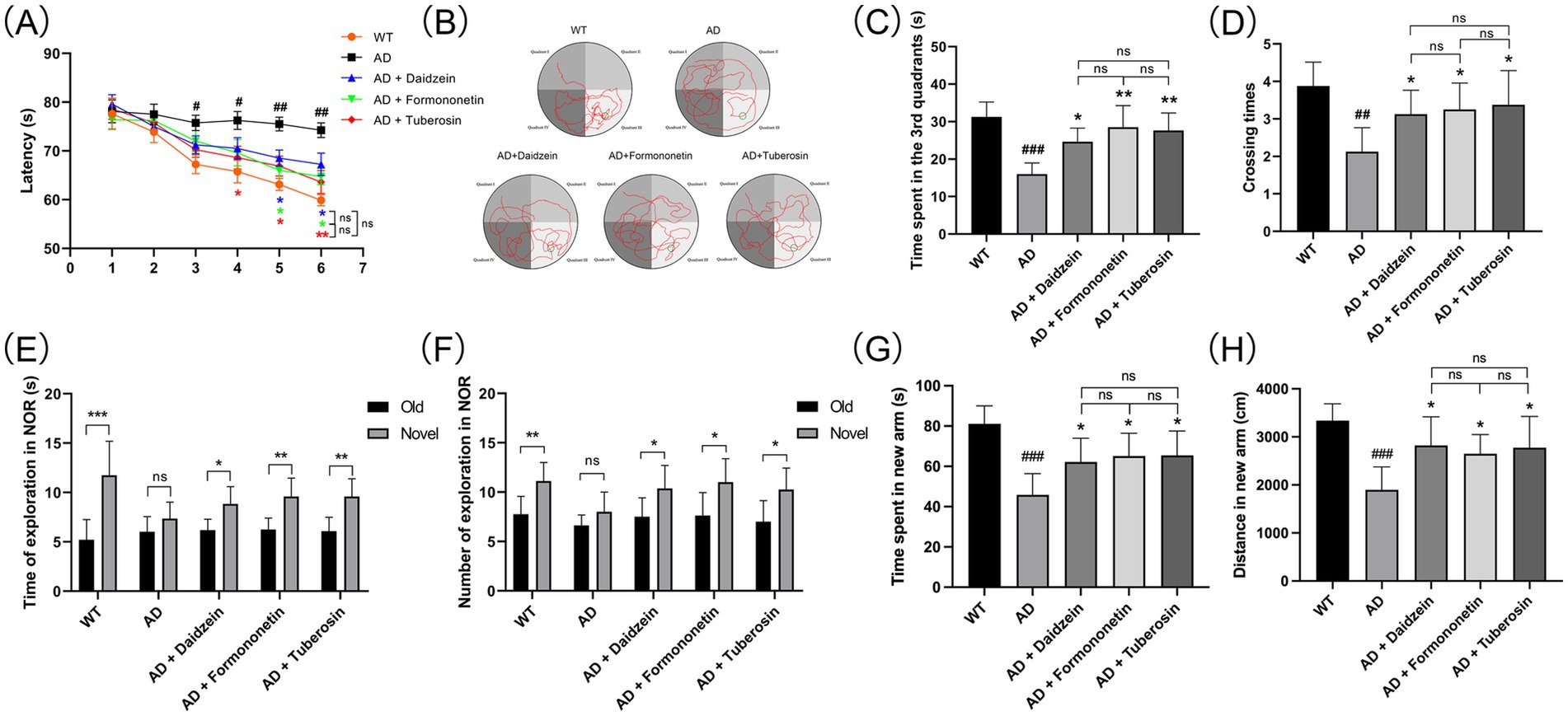 Figure 7. Pathological behavior of AD mice improved by active components of Pueraria. (A–D) MWM test results: Time to reach the platform (A), escape trajectory (B), time spent in the target quadrant (C), and number of platform crossings (D). (E,F) NOR test results: Time spent (E) and number of visits (F) to the novel object. (G,H) Y-maze test results: Time (G) and distance (H) spent in the new arm. All values are presented as mean ± SEM. ##p < 0.01 and ###p < 0.001 compared with the WT group by t-test. *p < 0.05 and **p < 0.01, compared with the AD group by two-way ANOVA.