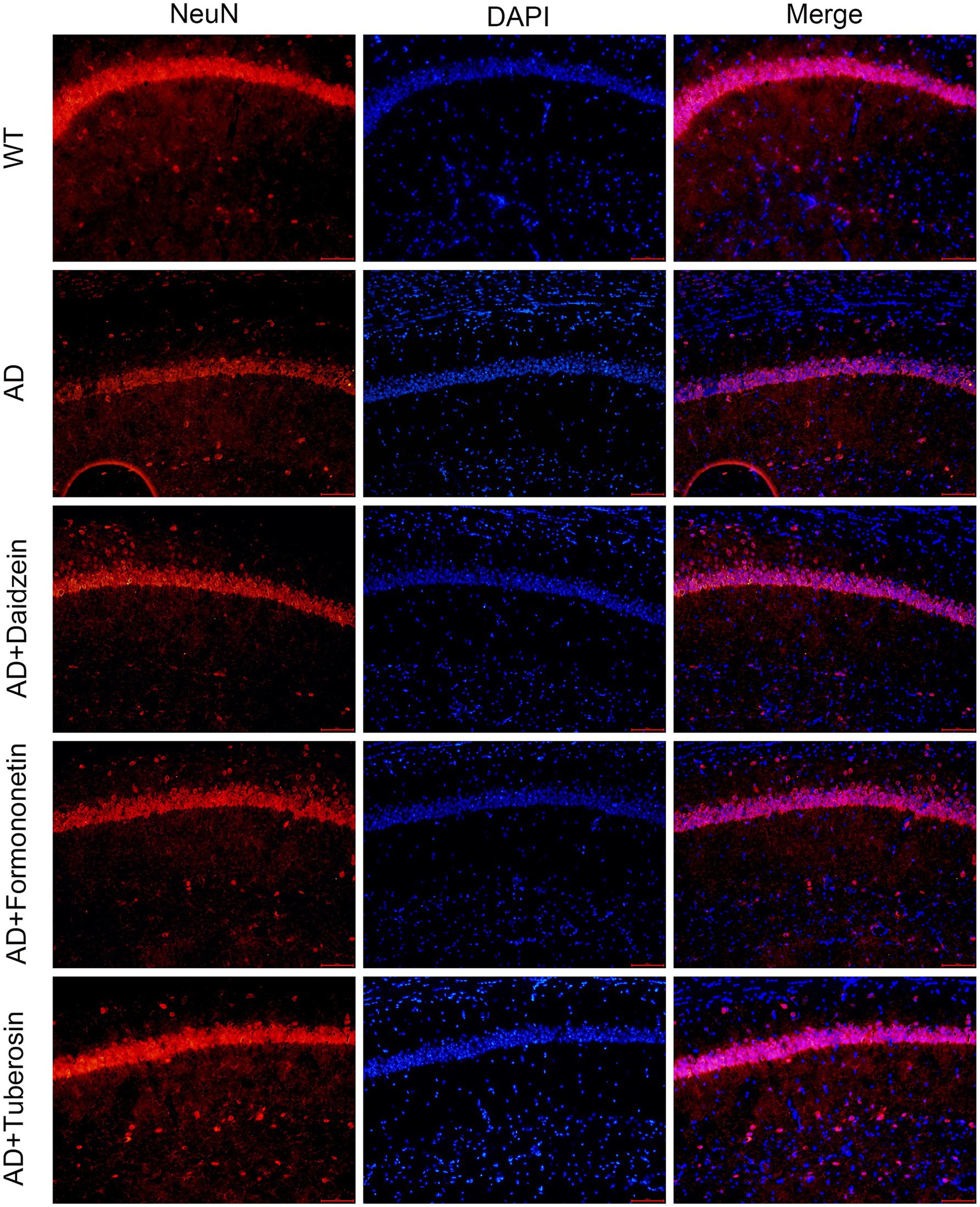 Figure 8. Active components of Pueraria improve neuronal loss in AD mice. Representative immunofluorescence images of NeuN, DAPI, and merge staining. The scale bar represents 100 μm.