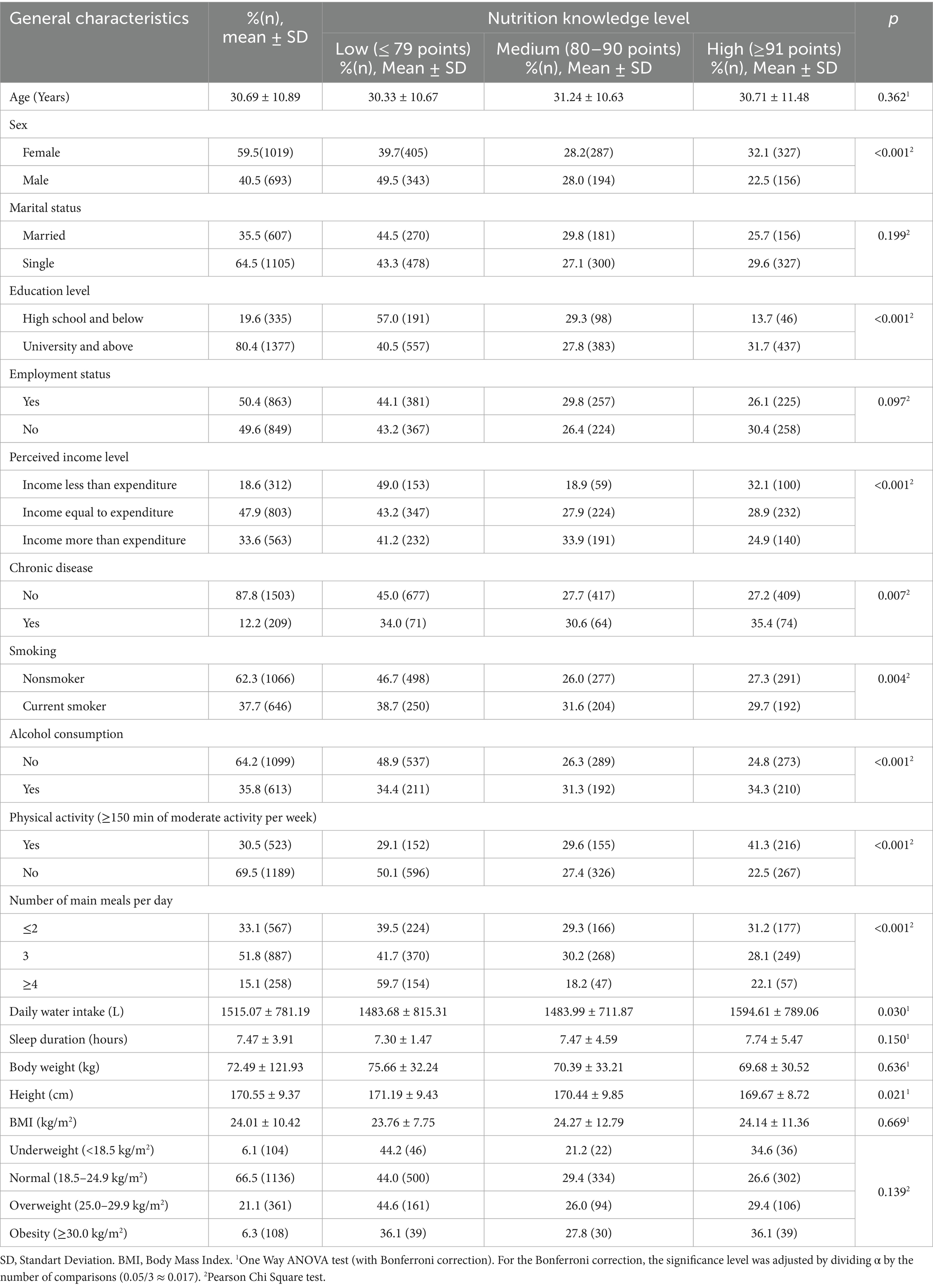 The participants’ mean age was 30.69 ± 10.89 years, 59.5% were female, and 35.5% were married. More than three-quarters (80.4%) had a university degree or higher, while about half (50.4%) were employed. Approximately one in five (18.6%) reported that their income was less than their expenses, and 12.2% had at least one chronic disease. In terms of lifestyle factors, 37.7% were smokers, 35.8% consumed alcohol, and only 30.5% engaged in the recommended level of physical activity. About half of the participants (51.8%) reported consuming three main meals per day. The mean daily water intake, sleep duration, body weight, height, and BMI were 1515.07 ± 781.19 L, 7.47 ± 3.91 h, 72.49 ± 121.93 kg, 170.55 ± 9.37 cm, 24.01 ± 10.42 kg/m2, respectively. According to BMI categories, 21.1% of the participants were classified as overweight, and 6.3% as obese. No statistically significant differences were found in the mean age, daily water intake, sleep duration, body weight, height, and BMI among individuals with low, medium, or high levels of nutritional knowledge (p > 0.05). The prevalence of low nutritional knowledge was significantly higher among men; individuals with a high school education or less; those whose income was lower than their expenditures; participants without chronic diseases; non-smokers; those who do not consume alcohol; those not engaging in physical activity; and individuals consuming four or more main meals per day (p < 0.05, Table 1).