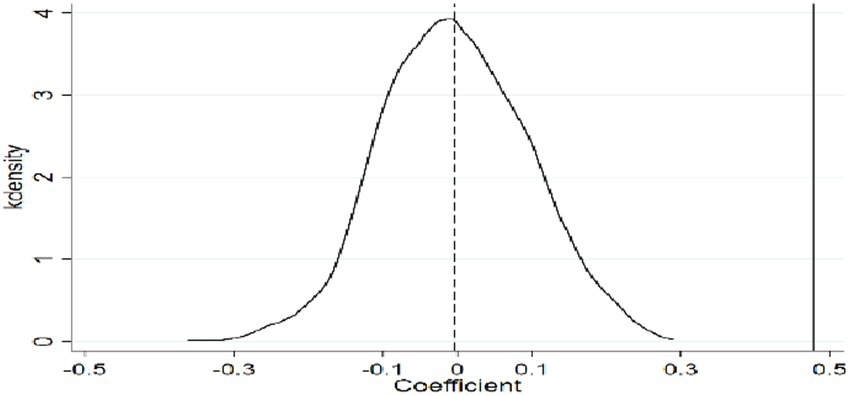 To further validate the positive effect of e-commerce operations on green food consumption of rural residents and control for potential unobserved or random factors, a placebo test is conducted. The results are shown in Figure 2. A “false” core independent variable is randomly assigned to the treatment and control groups, and the baseline model is re-estimated. After repeating the randomization process 1,000 times, the results show that the mean of the simulated kernel density distribution is concentrated around zero, while the true regression coefficient is significantly distant from this distribution. This confirms that the observed effect of e-commerce operations on green food consumption is not driven by unobserved factors, reinforcing the robustness of the baseline regression results.