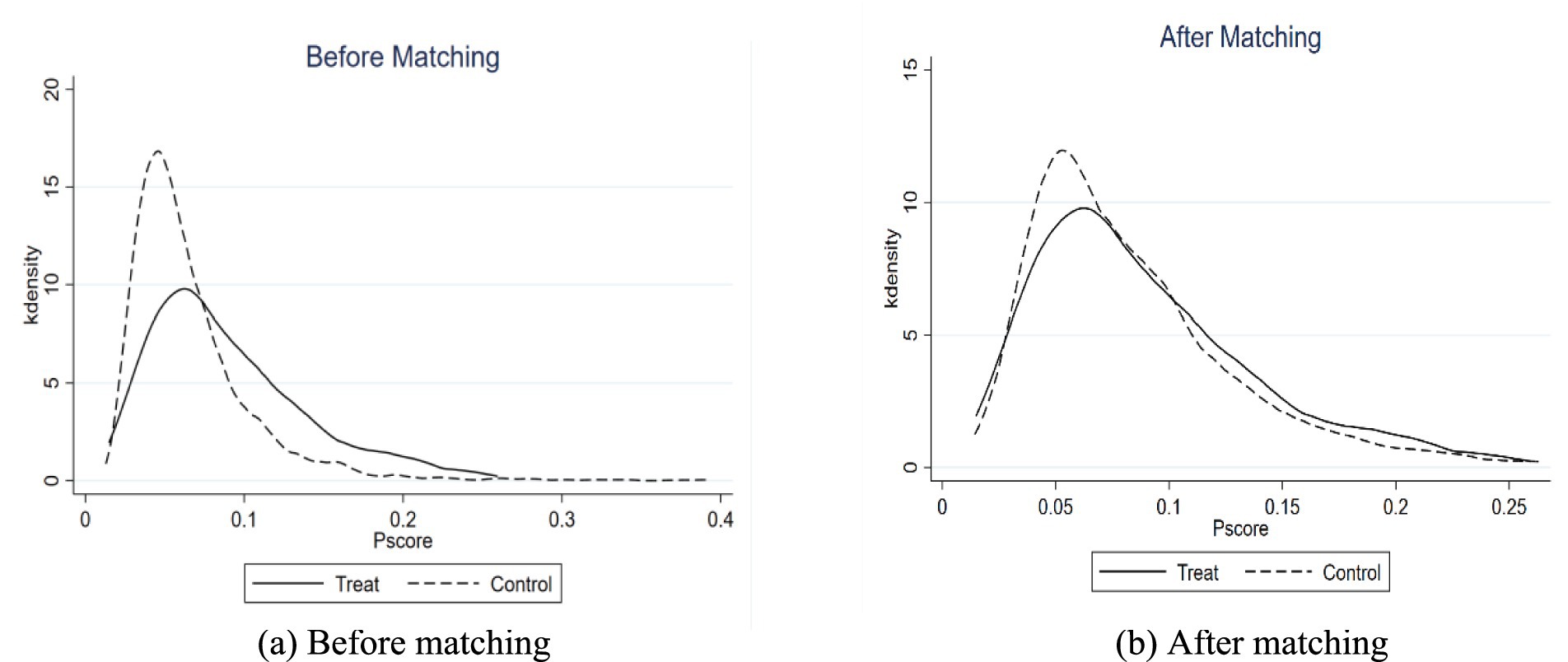 To evaluate whether the propensity score matching (PSM) effectively balances the data, a covariate balance test was conducted. The results are presented in Table 5. Taking the nearest neighbor matching method (1-to-1) as an example, the findings indicate that, compared to the pre-matching sample, the standardized mean differences for most control variables were substantially reduced after matching, with all falling below the commonly accepted threshold of 10%. Furthermore, the t-test results for these covariates fail to reject the null hypothesis of no systematic differences between the treatment and control groups. This suggests that the distribution of covariates between the two groups was successfully balanced. Therefore, the PSM results pass the balance test, confirming the robustness of the matching procedure.