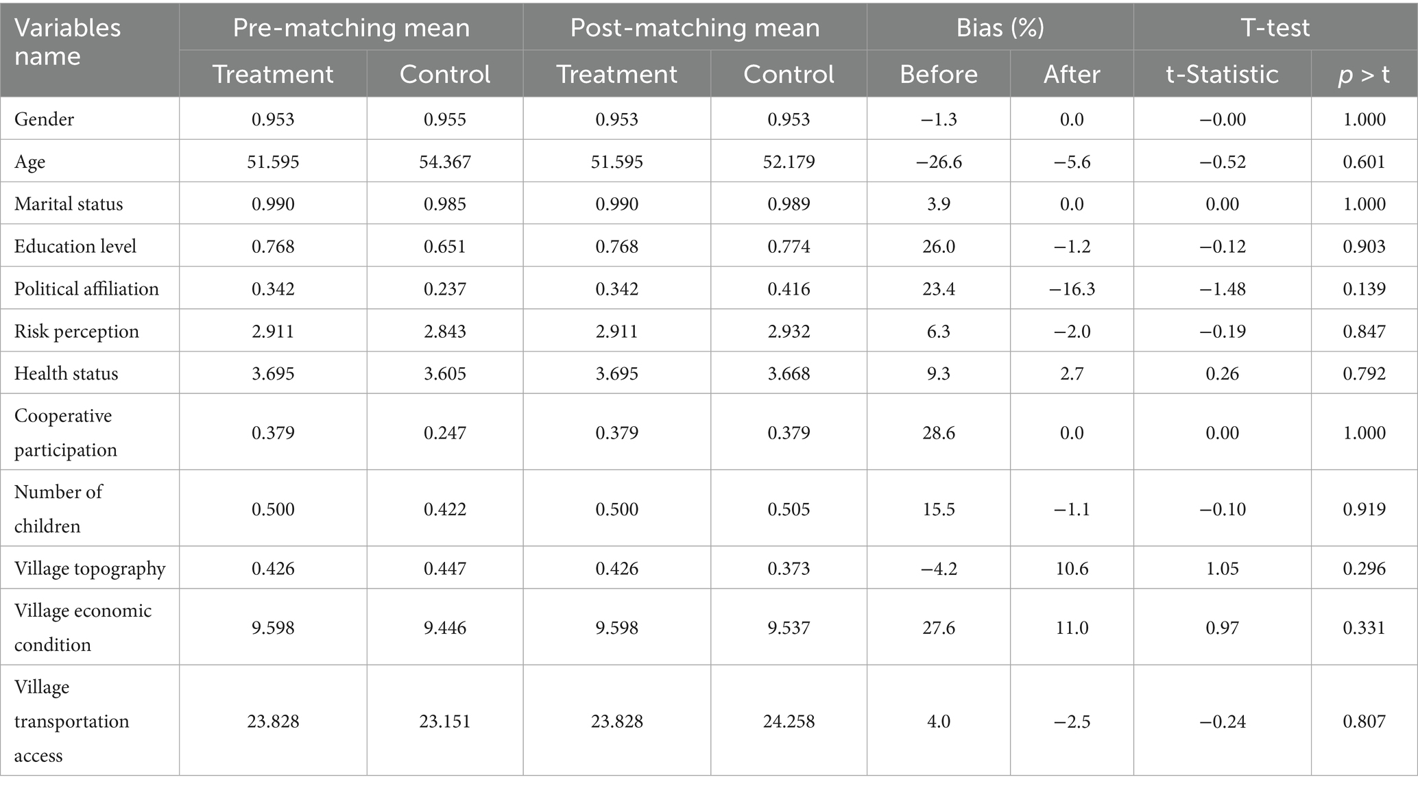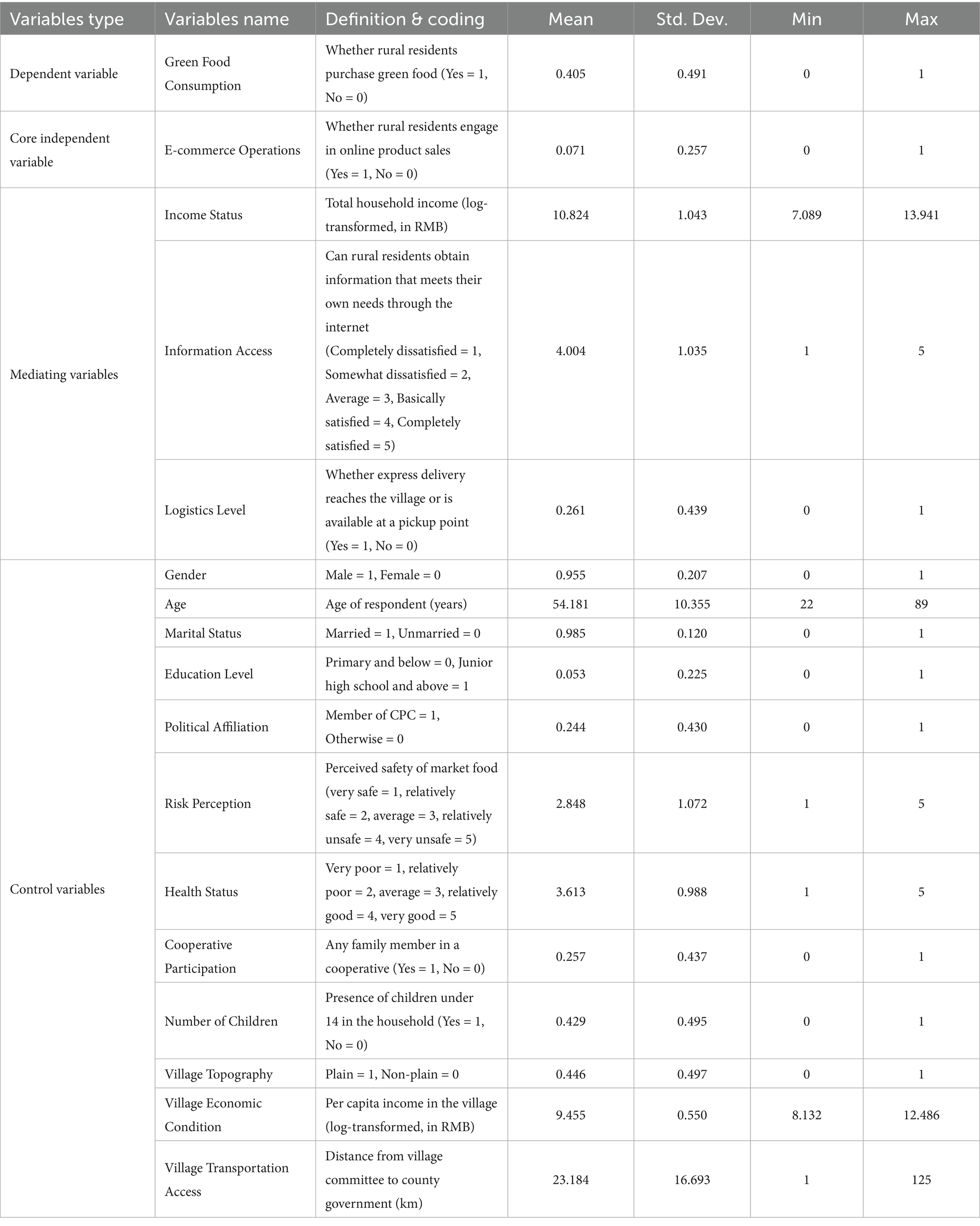In addition to e-commerce operations, other factors may also influence green food consumption of rural residents. Following the approach of Migheli (41), this study incorporates control variables across three dimensions: individual characteristics, household characteristics, and village characteristics. Individual characteristics include gender, age, marital status, education level, political affiliation, risk perception, and self-rated health status. Household characteristics include whether any household member participates in a cooperative and whether there are children under the age of 14 in the household. Village characteristics include village topography, village-level economic conditions, and transportation conditions. Descriptive statistics for all variables are presented in Table 1.