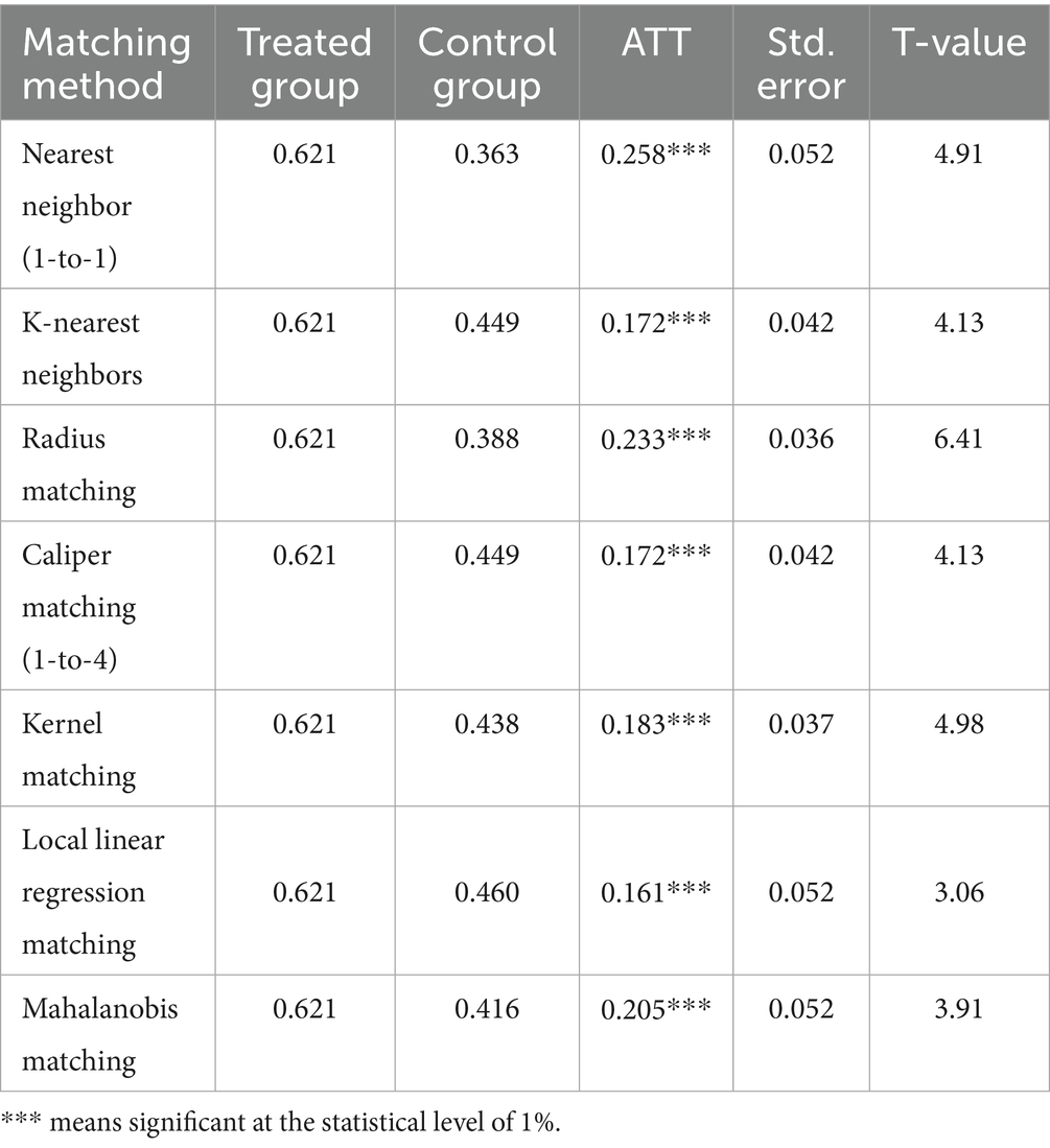 Given that e-commerce operations are self-selected behaviors among rural residents, the previous model may suffer from endogeneity due to potential self-selection bias. To address this issue, the Propensity Score Matching (PSM) method is employed. The PSM regression results in Table 4 show that regardless of whether propensity score matching methods such as nearest neighbor matching, radius matching, caliper matching, kernel matching, local linear regression matching, or Mahalanobis matching are used for estimation, e-commerce operations have a significant positive impact on green food consumption of rural residents. These results reinforce the reliability of the baseline findings by accounting for potential selection bias.