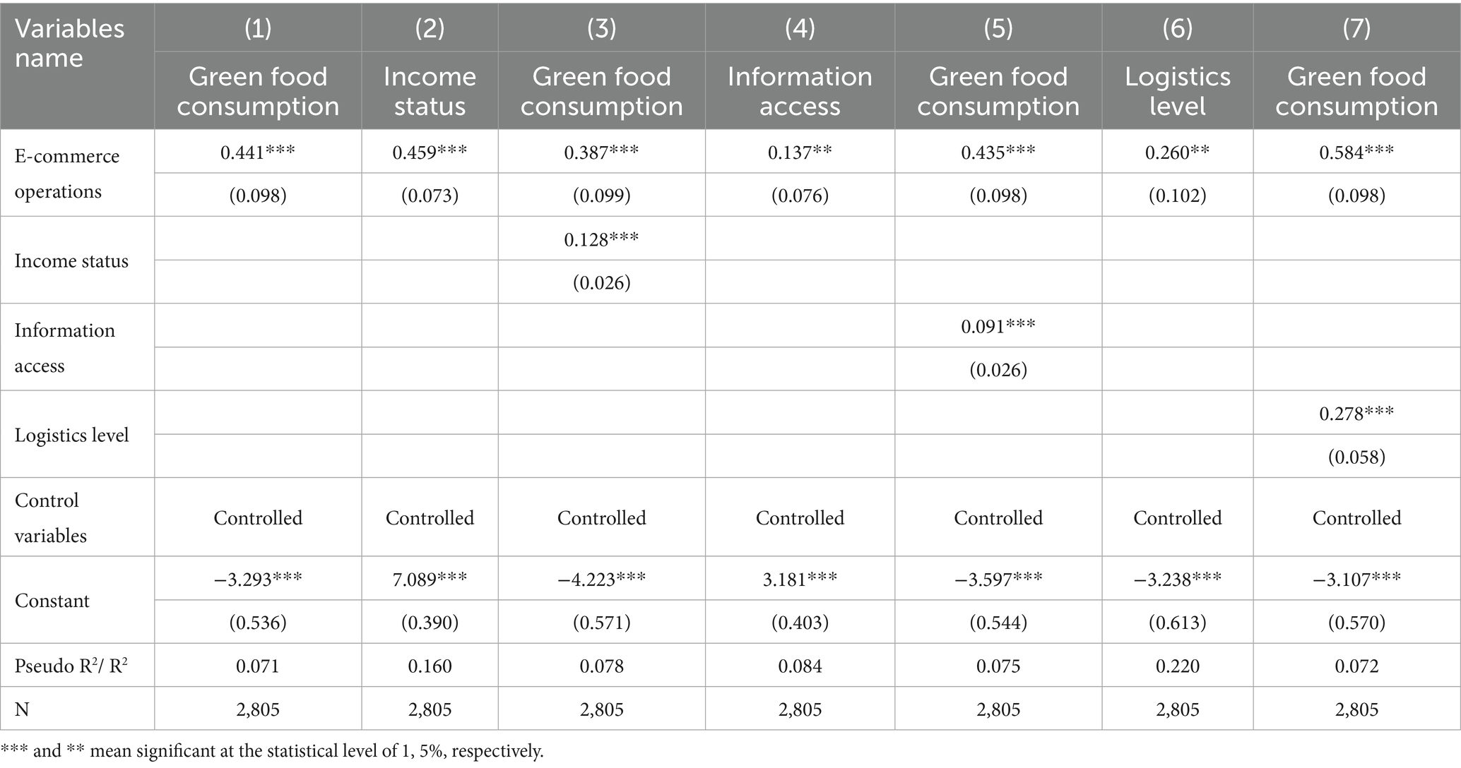 Based on the theoretical framework, e-commerce operations may influence green food consumption through three mediating pathways: income improvement, enhanced information access, and upgraded logistics. Following Qiu et al. (40), this study uses the total household income of rural residents to measure income level. Information access is captured by the respondent’s self-assessed ability to obtain information that meets their needs via the internet. Logistics infrastructure is measured by whether the respondent’s village has direct-to-door parcel delivery service or a designated parcel collection point.