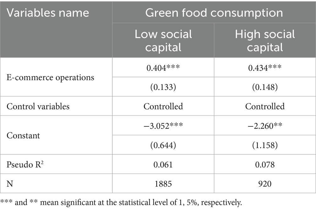 Social capital, encompassing the trust, norms, and cooperative relationships that rural residents accumulate through their social networks, can significantly influence their efficiency in resource acquisition, ability to identify credible information, and the effectiveness of value transmission during e-commerce activities. Consequently, the impact of e-commerce operations on green food consumption may vary depending on the level of social capital. To explore this heterogeneity, this study examines how the effect of e-commerce operations on rural green food consumption differs across groups with varying levels of social capital. The results are presented in Table 7. The findings indicate that e-commerce operations has a stronger positive effect on green food consumption of rural residents with high levels of social capital compared to those with low levels of social capital. A plausible explanation is that individuals in high social capital groups tend to possess broader social networks and more robust access to information, making it easier for them to obtain knowledge about green food. Moreover, their behavior is more likely to be influenced by social identity and peer recognition, thereby increasing the likelihood of engaging in green food consumption.
