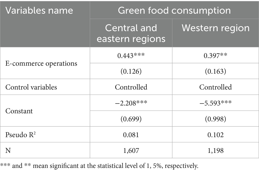 Significant disparities exist across regions in terms of resource endowments, institutional environments, and levels of economic development. These differences can influence rural residents’ awareness of and capacity for green food consumption, thereby affecting the impact of e-commerce operations on green food consumption outcomes. To examine this heterogeneity, the sample provinces were grouped into two categories: the central and eastern regions, and the western region. A subgroup regression analysis was then conducted, and the results are reported in Table 8. The findings reveal that e-commerce operations have a more pronounced effect on promoting green food consumption of rural residents in the central and eastern regions, compared to those in the western region. This may be attributed to the higher level of economic development and the more mature green food consumption market in the central and eastern regions. These favorable external conditions facilitate the effective conversion of information advantages and channel accessibility—brought about by e-commerce—into tangible consumption behavior among rural residents.