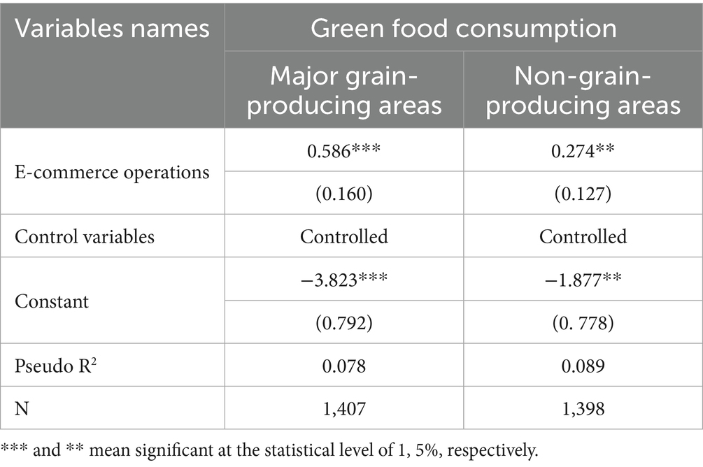 Agricultural functional zones differ significantly in terms of production structure, resource endowments, and industrial policy frameworks. These differences may influence how e-commerce operations affect green food consumption of rural residents. In this study, the sample provinces were categorized based on whether they belong to major grain-producing areas, thereby forming distinct agricultural functional zones. The heterogeneity of e-commerce’s impact across these zones was then examined. The results are presented in Table 9. The findings suggest that the effect of e-commerce operations on green food consumption is stronger in major grain-producing areas compared to non-grain-producing regions. A possible explanation is that the agricultural infrastructure in major grain-producing regions is more developed, and environmental regulations are more rigorously enforced. As a result, e-commerce activities in these areas are more likely to adhere to green production standards. This enhances rural residents’ trust in green food products, thereby increasing their willingness to engage in food green consumption.