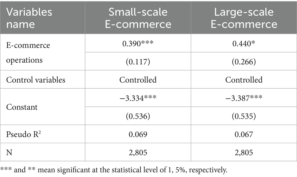Significant differences exist between e-commerce operators of varying operation scales in terms of resource acquisition capabilities and market awareness. To further explore this heterogeneity, the present study examines the impact of e-commerce operations on green food consumption of rural residents under different operation scales. The results are presented in Table 11. The findings indicate that large-scale e-commerce operators have a stronger positive effect on green food consumption of rural residents compared to small-scale or informal e-commerce participants. One possible explanation is that large-scale e-commerce activities require rural operators to engage more deeply with market trends, quality standards, and certification systems related to green food. This level of engagement enhances their understanding of the value and importance of green food, which, in turn, shapes their personal consumption preferences. Additionally, large-scale e-commerce operators typically have access to more extensive and reliable supply chain networks, which provide easier and lower-cost access to diverse and high-quality green food products. Their operational experience also leads to the accumulation of specialized knowledge in areas such as storage and freshness preservation, thereby increasing the convenience and feasibility of personal consumption. Moreover, as promoters of green food products to customers, large-scale e-commerce operators are more likely to serve as behavioral exemplars, reinforcing their own green food consumption habits. Income gains from large-scale further strengthen their financial capacity to purchase green food. In contrast, small-scale e-commerce operators generally face limitations in market insights, resource access, purchasing power, and role-model effects, which constrain the extent to which their business activities influence their own green food consumption behaviors.