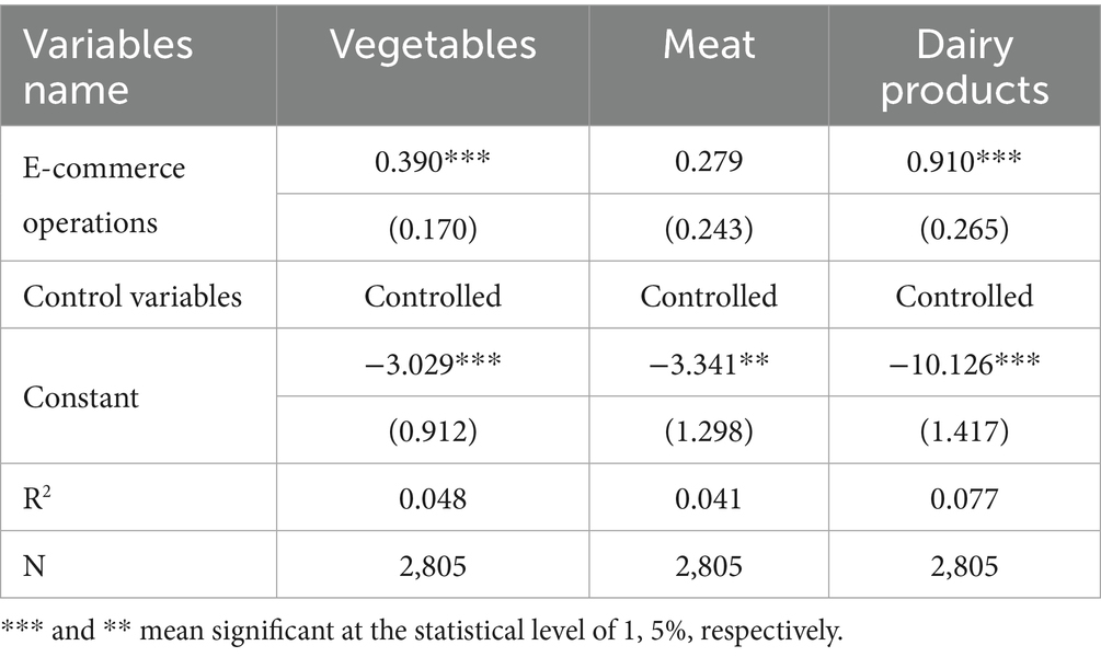 Different types of green food vary significantly in terms of their product attributes, consumption scenarios, price sensitivity, and distribution characteristics. To further examine these distinctions, this study investigates the heterogeneous effects of e-commerce operations on the consumption of different types of green food. The results are presented in Table 13. The findings show that e-commerce operations more significantly promote the consumption of vegetables and dairy products compared to meat products. This result may be explained by the fact that vegetables and dairy products are more compatible with the operational advantages of e-commerce, such as standardized packaging and cold-chain logistics, which help ensure product quality. Moreover, these products typically have lower unit prices and are consumed more frequently in daily life. The broad range of options and convenient purchasing channels accessible through e-commerce platforms can quickly meet the everyday dietary needs of rural residents. In addition, promotional campaigns and traceability features provided by e-commerce platforms further reduce concerns related to food safety and authenticity for these product types. In contrast, meat products—especially fresh meat—pose greater logistical challenges due to higher cold-chain requirements and transport costs. Rural residents also tend to prefer purchasing meat through offline markets where they can visually assess freshness and quality. Given the higher unit price and larger quantity per purchase, the logistical and informational advantages of e-commerce may not fully compensate for these preferences. Furthermore, meat consumption in rural areas is often shaped by habitual dietary patterns, with relatively inelastic demand. As a result, the ability of e-commerce operations to stimulate increased meat consumption is weaker compared to its influence on vegetable and dairy consumption.