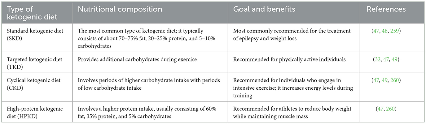 Several common variants of KD exist, differing in the macronutrient ratios (47, 48). These include the standard ketogenic diet (SKD), the targeted ketogenic diet (TKD), the cyclical ketogenic diet (CKD), and the high-protein ketogenic diet (HPKD). The different variations of KD are selected to suit the individual patient's needs and therapeutic goals (Table 1) (47–49).