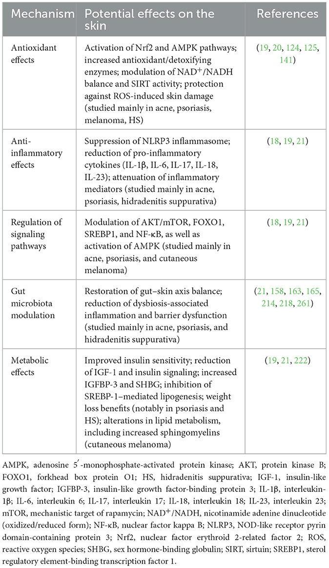KD is widely used as an adjuvant therapy for many diseases. It is a well-established therapeutic approach for the treatment of drug-resistant epilepsy, particularly in children. Research findings indicate that after 3 months of KD use, the frequency of epileptic seizures decreases by at least 50% (69, 70). It has also been applied successfully in patients with overweight and obesity (71). Meta-analyses of clinical trials indicate that KD leads to faster weight loss in the short term, with optimal results usually achieved within the first 3–6 months (71, 72). A key aspect of KD compared to other weight loss diets is its ability to regulate hunger and satiety (71, 73). KD has also emerged as a promising dietary intervention for treating insulin resistance and type 2 diabetes (74). Scientific evidence shows that it reduces fasting glucose and glycated hemoglobin (HbA1c) levels in patients with type 2 diabetes (75). KD also shows potential in the prevention and treatment of cardiovascular disease (76). This diet usually leads to an increase in HDL cholesterol and a decrease in triglycerides (76, 77). However, there is evidence that it may also increase LDL cholesterol in some patients, which increases the risk of cardiovascular disease. KD has also shown promising effects on Alzheimer's disease (AD) and Parkinson's disease (PD) (78). Studies suggest that KD may support cognitive function in early AD and motor function in PD patients (78). There is preliminary evidence that it may benefit individuals with autism spectrum disorder (ASD) (79). Numerous scientific studies also confirm the beneficial effects of KD in treating certain types of cancer (39, 80, 81). The key anti-cancer mechanism of KD is carbohydrate reduction, which leads to lower glucose levels and slower proliferation of cancer cells (39, 82). KD is also used in glucose transporter 1 (GLUT1) deficiency syndrome to provide an alternative source of energy for the brain in conditions of impaired glucose access (83). It is also a beneficial dietary intervention in polycystic ovary syndrome (PCOS) (84). In addition, KD's effect on reducing oxidative stress and inflammation has also been confirmed (85). The role of KD in reducing the severity of symptoms in many skin conditions and its beneficial effects on the skin are also gaining recognition (14, 18–20). The therapeutic potential of KD is shown in Figure 1, whereas the key mechanisms specifically related to skin health are summarized in Table 2.