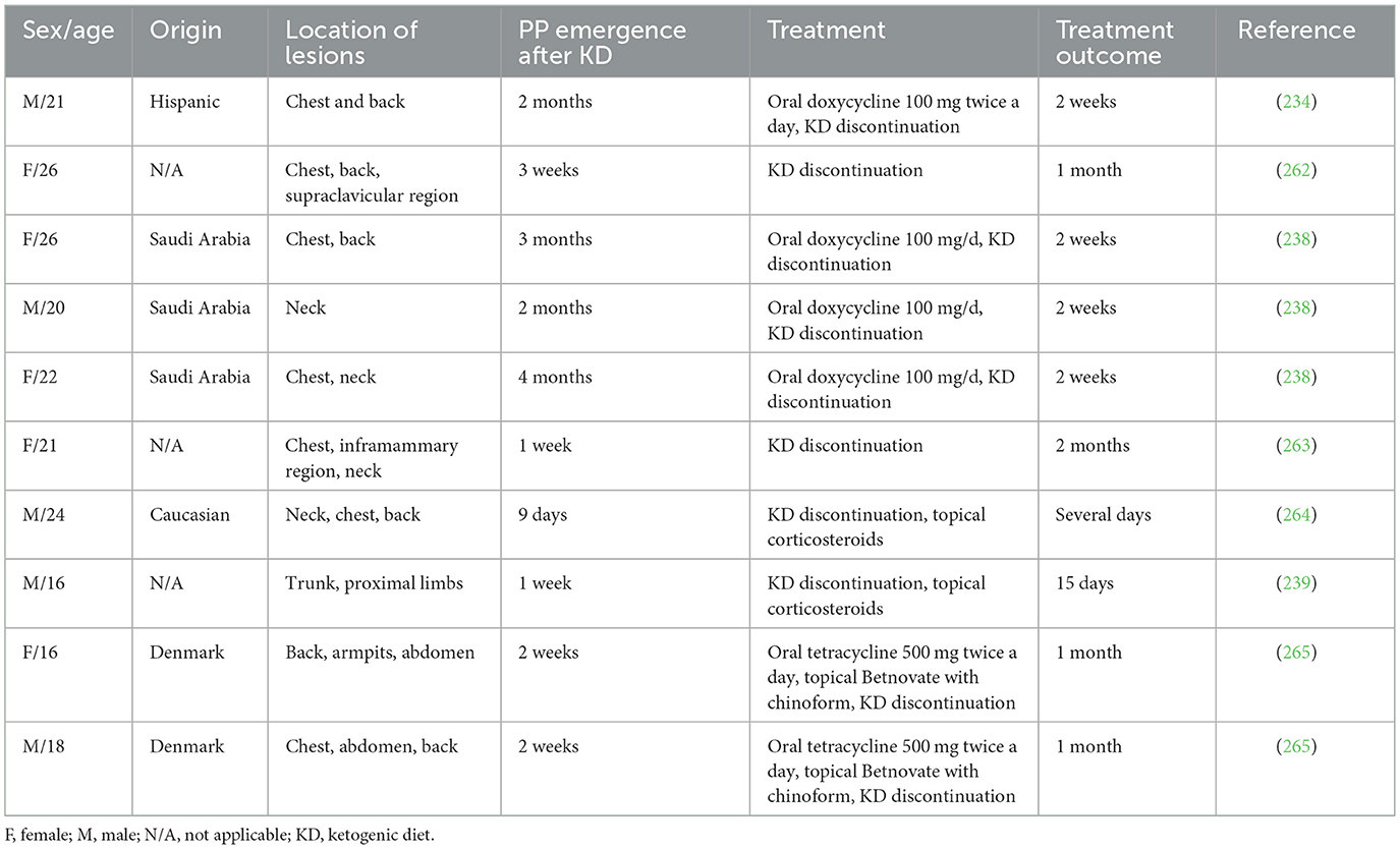 In the majority of the cases described, doxycycline 100 mg/day was used to treat PP. However, tetracycline, minocycline, dapsone, and topical corticosteroids are also mentioned as treatment options (234, 235, 237). KD discontinuation and a return to a balanced diet are also necessary. Some patients did not use drug treatment, and PP lesions resolved after KD discontinuation (234). Further studies are needed to clarify the exact mechanisms by which KD influences the development of PP.