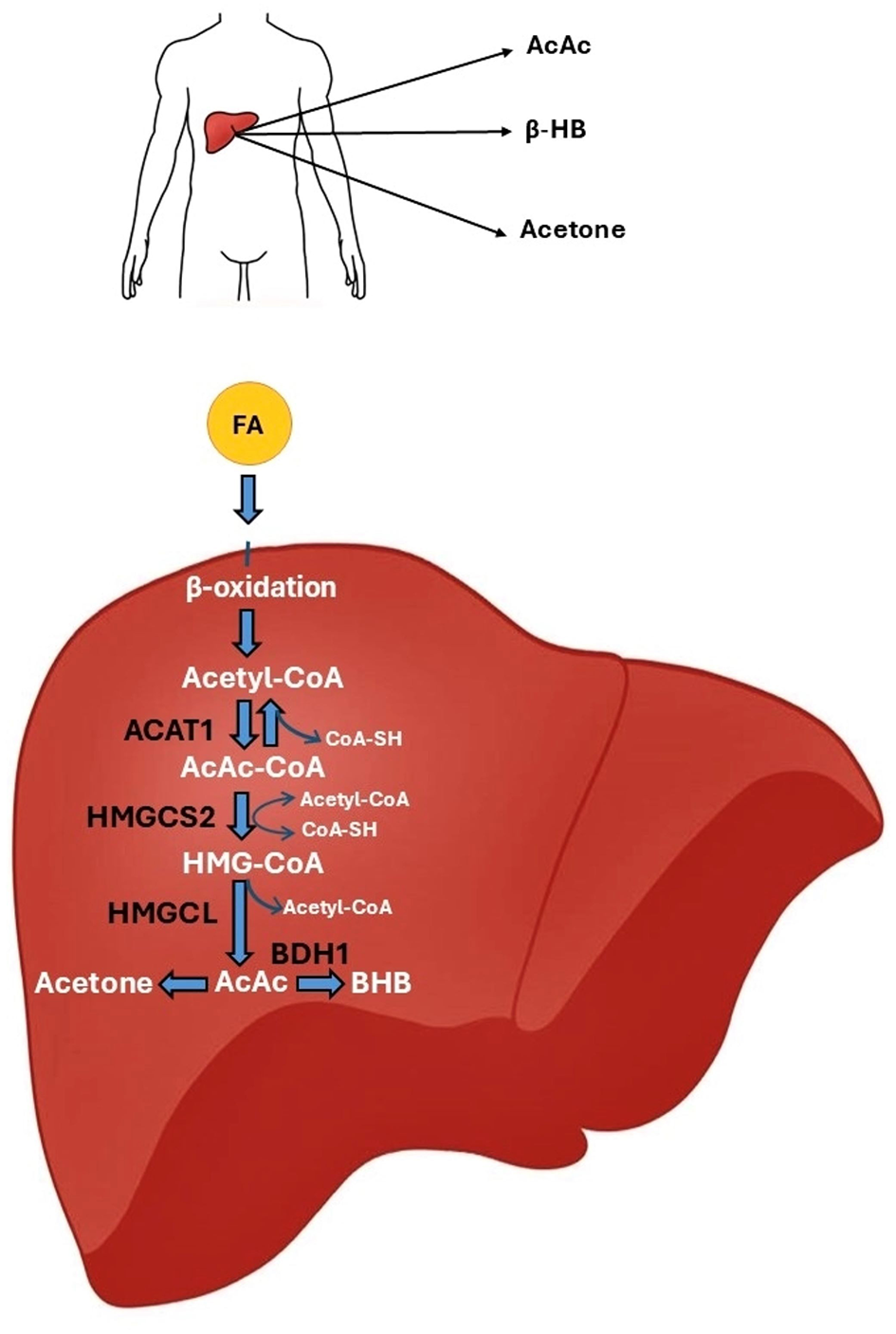 Ketogenesis occurs in the liver, specifically, in hepatocytes, through the mitochondrial β-oxidation of fatty acids. It is a complex mechanism. It involves the conversion of acetyl-CoA to ketone bodies: AcAc, BHB, and acetone. In the first step of ketogenesis, the two acetyl-CoA molecules react with each other. Under the influence of thiolase (acetyl-CoA acetyltransferase 1, ACAT1), CoA-SH is detached from one molecule of acetyl-CoA, and acetoacetyl-CoA (AcAc-CoA) is formed. AcAc-CoA then combines with another acetyl-CoA molecule to form 3-hydroxy-3-methylglutaryl-CoA (HMG-CoA). This reaction is catalyzed by 3-hydroxy-3-methylglutaryl-CoA synthase 2 (HMGCS2). Subsequently, 3-hydroxy-methylglutaryl-CoA lyase (HMGCL) cleaves HMG-CoA in an irreversible reaction into acetyl-CoA and the first ketone body, AcAc. AcAc is converted in a reversible reaction catalyzed by D-β-hydroxybutyrate dehydrogenase (BDH1), leading to the formation of BHB, or undergoes non-enzymatic decarboxylation with the formation of acetone (Figure 2) (104, 105).