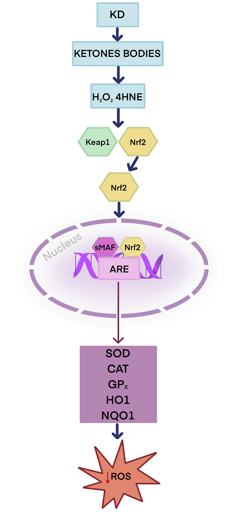 Potential antioxidant role of the ketogenic diet—Keap1–Nrf2–ARE antioxidant response pathway. The ketogenic diet produces ketone bodies that enhance the production of H2O2 and 4-HNE. H2O2 and 4-HNE activate Nrf2. Nrf2 is released from the Nrf2–Keap1 complex and travels to the cell nucleus, where it forms heterodimers with sMAF proteins, allowing it to bind to ARE sequences in DNA. Nrf2 activates antioxidant and detoxification enzymes: SOD, CAT, GPX, HO-1, and NQO1. ARE, antioxidant response element; CAT, catalase; GPX, glutathione peroxidase; 4-HNE, 4-hydroxynonenal; H2O2, Hydrogen peroxide; HO-1, heme oxygenase; KD, ketogenic diet; Keap 1, Kelch-like ECH-associated protein 1; Nrf2, nuclear factor erythroid 2-related factor 2; NQO1, NAD(P)H quinone dehydrogenase 1; SOD, superoxide dismutase; sMAF, small musculoaponeurotic fibrosarcoma protein.