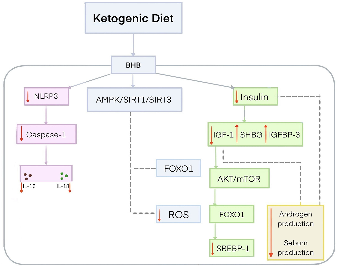 Potential mechanism for the effect of the ketogenic diet on acne. The ketogenic diet produces BHB, which inhibits the activity of NLRP3 and thereby reduces the pro-inflammatory cytokines IL-1β and IL-18 by inhibiting caspase-1 activation. BHB activates AMPK/SIRT1/SIRT3 signaling, leading to FOXO1 inhibition and reduced ROS levels. BHB contributes to lower insulin levels, leading to a reduction in IGF-1 and an increase in IGFBP-3. The reduction of insulin and IGF-1 increases SHBG concentrations, resulting in reduced androgen activity and lower sebum production. Decreased IGF-1 concentrations lead to AKT/mTOR inhibition and FOXO1 activation. FOXO1 inhibits SREBP1. AKT, protein kinase B; AMPK, adenosine 5′-monophosphate-activated protein kinase; FOXO1, forkhead box protein O1; IGF-1, insulin-like growth factor; IGFBP-3, insulin-like growth factor-binding protein 3; IL-1β, interleukin-1β; IL-18, interleukin 18; mTOR, mechanistic target of rapamycin; NLRP3, NOD-like receptor pyrin domain-containing protein 3; SHGB, sex hormone-binding globulin; SIRT 1, sirtuin 1; SIRT 3, sirtuin 3; SREBP1, sterol regulatory element-binding transcription factor 1.