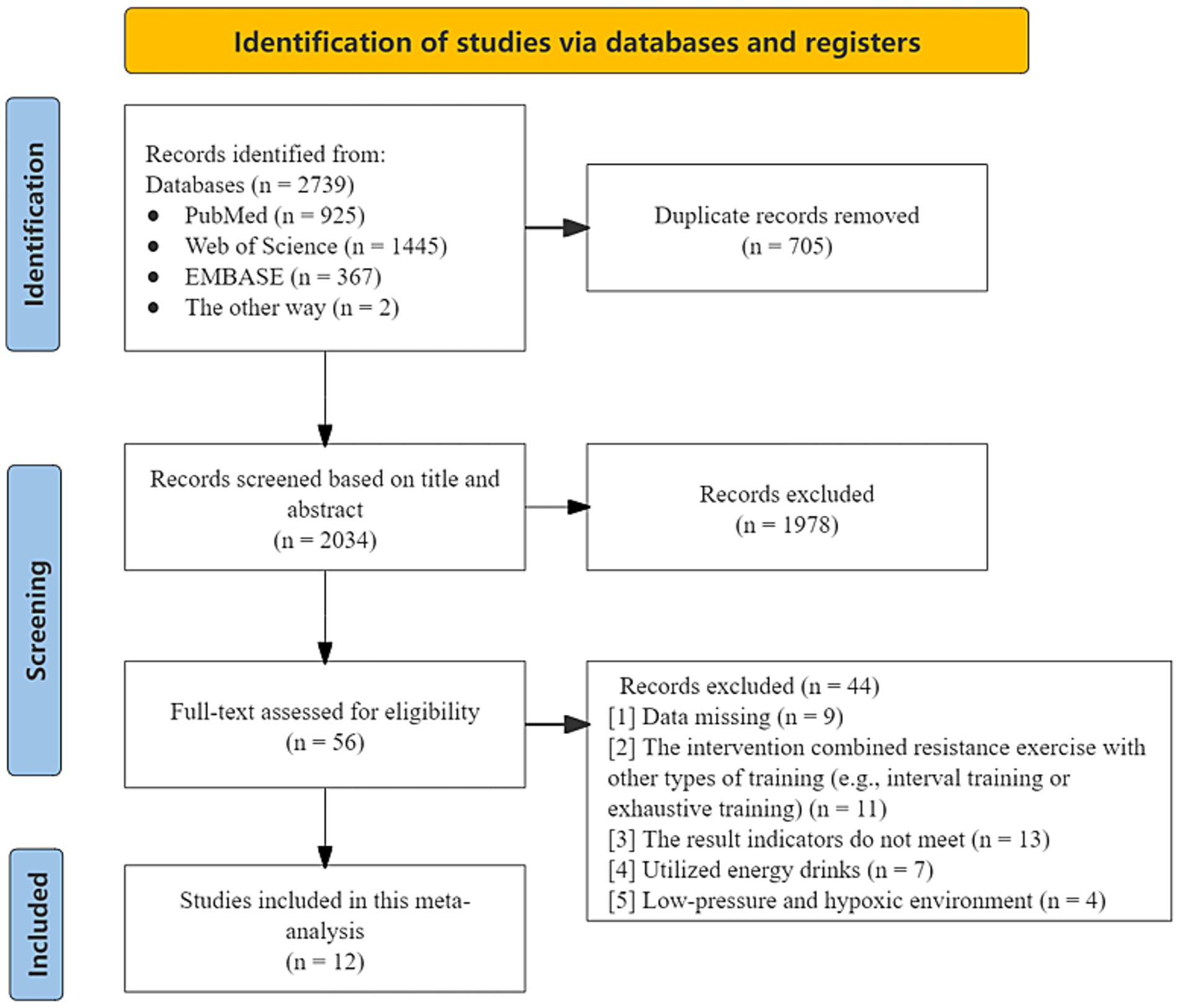 A total of 2,739 studies were initially identified through database searches. After removing 705 duplicates, 2,034 studies were screened based on titles and abstracts. Fifty-six studies underwent full-text screening, and 12 studies met the inclusion criteria and were included in the meta-analysis (17–25, 28, 37, 38) (Figure 1). Due to multiple conditions within some studies (e.g., different sexes, doses or loads), several contributed more than one dataset, resulting in 67 trials from 12 studies in subgroup analysis (Table 1) (17–25, 28, 37, 38). The total sample size consisted of 230 resistance-trained or recreationally active participants, aged 20–29 years. The habitual caffeine consumption of most study participants ranged from naive to moderate (0–6 mg/kg/day), with the exception of one study reporting an intake of 632 mg/day. Reported caffeine doses varied from 3 to 12 mg/kg. All studies administered caffeine in liquid or capsule form 60 min before exercise, expect one, which used caffeinated gum 15 min prior.