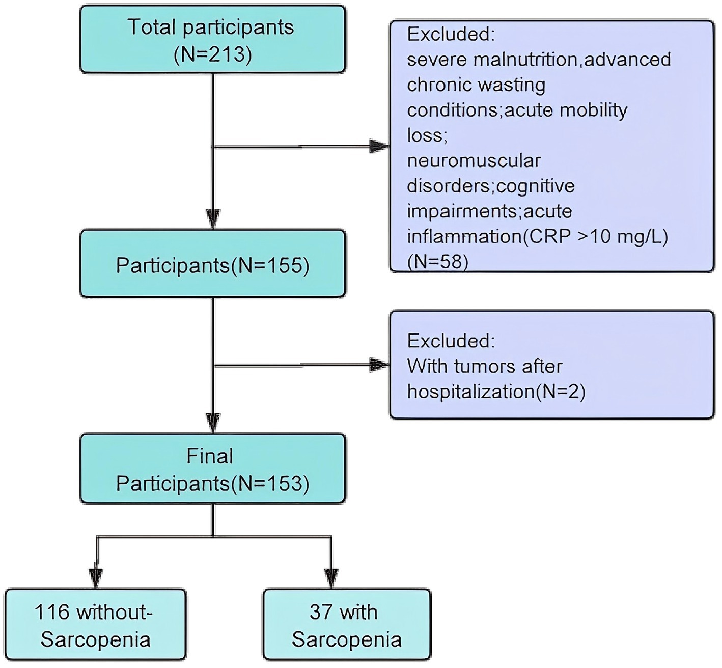 This study focused on older inpatients from the Integrated Medical and Elderly Care Center of Chengdu First People’s Hospital. Data were collected from December 2023 to May 2025, involving 153 eligible participants recruited through convenience sampling. The inclusion criteria were as follows: (1) age ≥ 65 years, (2) voluntary participation with written informed consent, (3) physical capability to perform the sarcopenia test independently, and (4) availability of complete clinical data. The exclusion criteria were as follows: (1) severe malnutrition; (2) advanced chronic wasting conditions, such as late-stage malignancies, severe chronic kidney disease (the estimated glomerular filtration rate eGFR < 30), severe diabetes, or other diseases or physiological conditions that could affect muscle mass; (3) acute mobility loss, particularly in those with fractures that limit movement, especially post-hip fractures; (4) patients diagnosed with neuromuscular disorders, such as Parkinson’s disease; (5) cognitive impairment; (6) acute inflammation (CRP > 10 mg/L) (Figure 1).