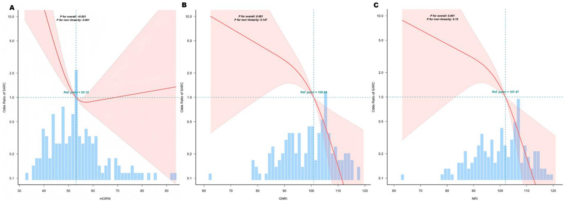 Three graphs labeled A, B, and C show the odds ratio of SARC against variables mGRNI, GNRI, and NRI, respectively. Each graph includes a red curve with a shaded confidence interval, histogram data, and reference points: 53.12 for A, 100.89 for B, and 101.97 for C. P-values for overall and non-linearity are noted on each graph.