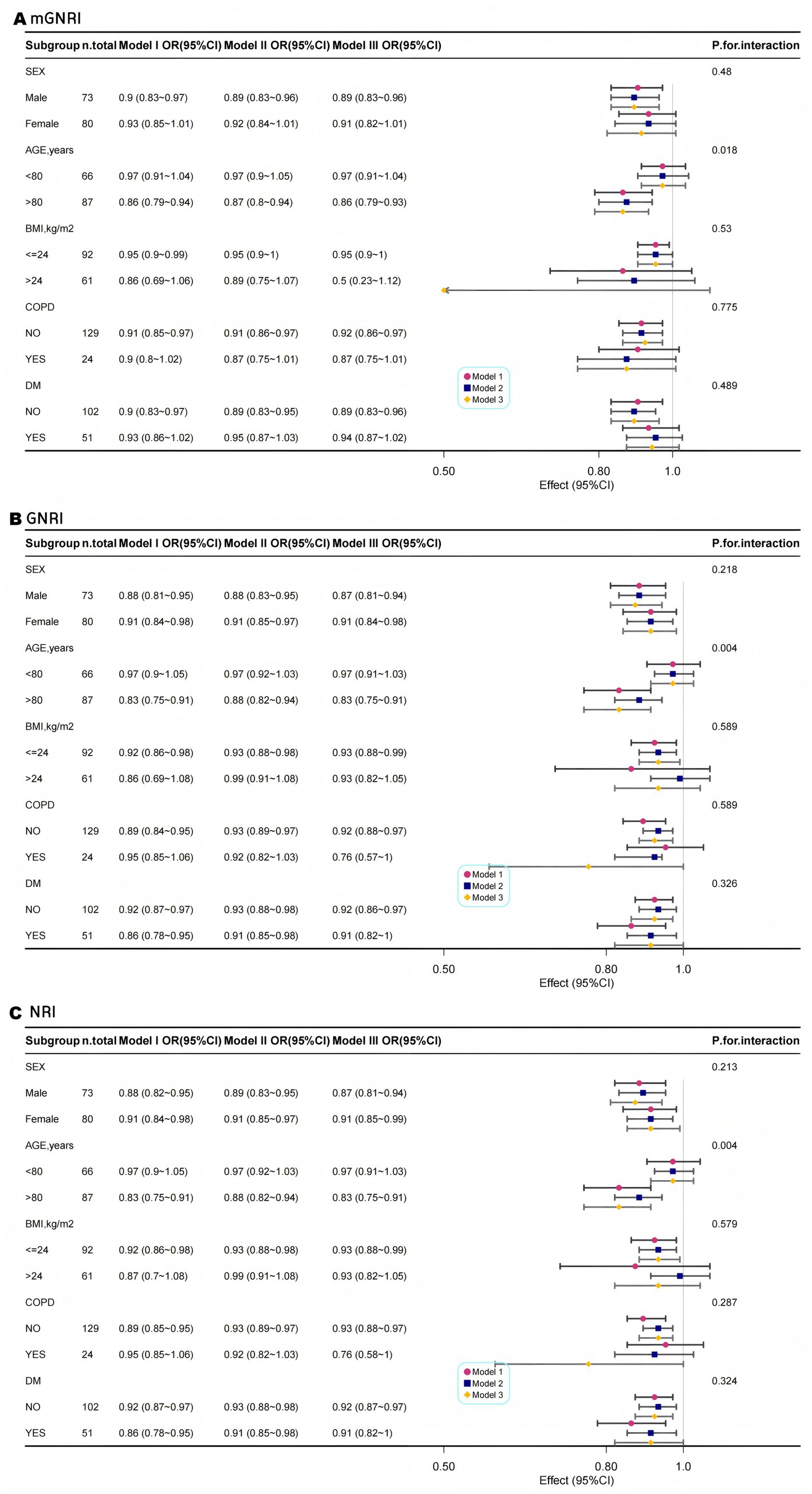 Figure 3. Multimodal subgroup logistic regression analysis and forest plots of the association between mGNRI (A), GNRI (B), NRI (C), and sarcopenia.