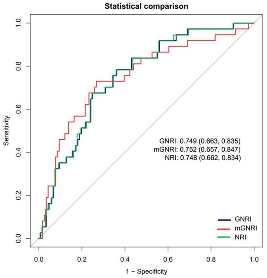 Figure 4. Receiver operating characteristic curves assessing the predictive ability of mGNRI, GNRI, and NRI.
