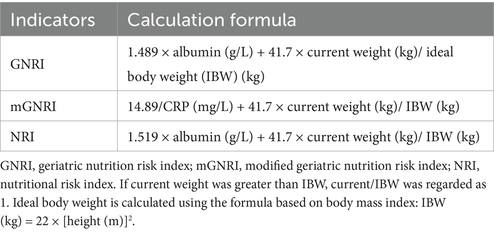 The calculation methods used for these three nutritional composite indicators are listed in Table 1. These methods are based on previous studies (12). The method for calculating ideal body weight was determined based on the participant’s height and body mass index (BMI) of 22 kg/m2.
