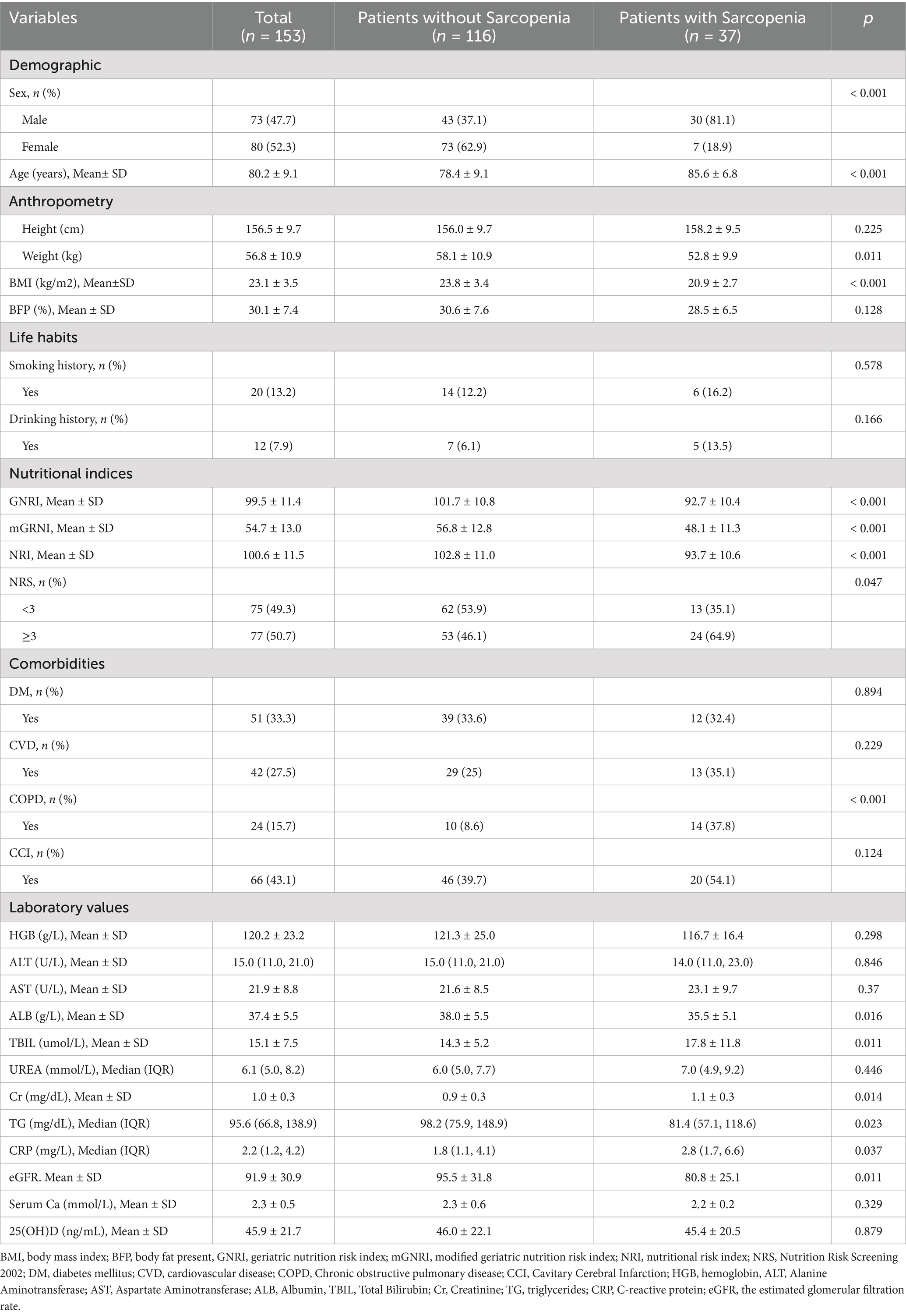A total of 153 patients were recruited for the study after rigorous screening based on the established inclusion and exclusion criteria. The overall prevalence of sarcopenia was 24.2% (n = 37; total = 153). Baseline characteristics of the groups categorized according to the presence of sarcopenia are shown in Table 2. Participants diagnosed with sarcopenia were generally older, had a higher proportion of males, and demonstrated significantly lower body weight, BMI, and nutritional indices (including GNRI, mGNRI, and NRI) than those without sarcopenia (all p < 0.05). Furthermore, patients with sarcopenia exhibited a greater prevalence of nutritional risk (NRS ≥ 3) and COPD, alongside lower serum albumin levels, higher total bilirubin, elevated serum creatinine, reduced triglycerides, increased C-reactive protein, and lower eGFR (all p values < 0.05). However, no significant differences were noted between the two groups in terms of height, body fat percentage, smoking history, alcohol consumption, diabetes mellitus, cardiovascular diseases, Charlson Comorbidity Index, hemoglobin, alanine aminotransferase, aspartate aminotransferase, urea, serum calcium, and 25-hydroxyvitamin D levels (all p > 0.05).