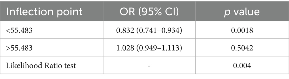 Restricted cubic spline analyses revealed a significant L-shaped relationship between mGNRI and sarcopenia risk (p for non-linearity < 0.05; Figure 2A). Below the inflection point (55.48), each unit increase in mGNRI reduced sarcopenia risk by 16.8% (OR = 0.832, 95% CI: 0.741–0.934) in multivariable-adjusted models. Above 55.48, mGNRI showed no significant association with sarcopenia (p > 0.05), with the dose–response curve flattening along the null effect line (OR = 1.0) (Table 3). Through 1,000 bootstrap resampling validations, the 95% confidence interval for this inflection point ranges from 55.07 to 55.89, indicating that the estimate demonstrates good stability.